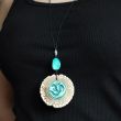 Oryginalny ceramiczny wisior z tybetańskim symbolem, wykonany z jasnej szamotowej gliny wypalonej w temp. ok. 1100 st. C, z turkusowym kamykiem. Szkliwiony brązowym i turkusowym szkliwem. Zawieszony na sznurku jubilerskim, zakładany przez głowę.