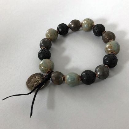 Unikatowa artystyczna bransoletka. Połączenie własnoręcznie wykonanych korali ceramicznych i korali z lawy wulkanicznej. Korale ceramiczne precyzyjnie szkliwione dwoma rodzajami szkliw wysokotemperaturowych - w odcieniach zieleni i odcieniach starego złota z metalicznym połyskiem. Pomiędzy każdym koralem znajduje się efektowna przekładka z hematytu w kolorze miedzi.
