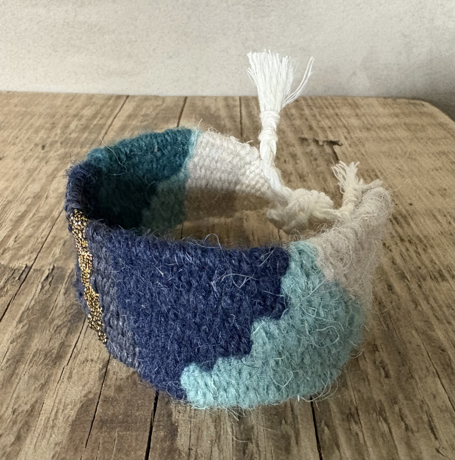 Wykonana z wielokolorowych włóczek naturalnych tj. wełna i bawełna z dodatkiem nici metalicznej.