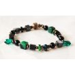 Subtelna bransoletka prawie w całości wykonana z połączenia różnych kamieni półszlachetnych, tj.: metalicznych hematytów w kształcie sześcianów (5 mm), czarnych kulek z onyksu (5 mm), kostek zielonych chryzokoli (6 mm), chryzokoli w kształcie krążków, jednej kulki szarego chalcedonu (8 mm), oraz dwóch zielonych kryształków swarovskiego. Kamienie przetykane są metalicznymi koralikami.