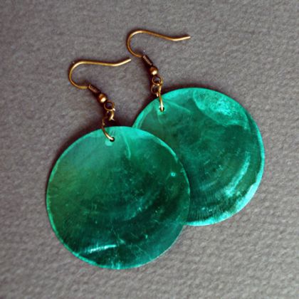 Super lekkie i zwiewne kolczyki wykonane z barwionej muszli w kolorze turkusowym. Cieniutkie plasterki muszli są transparentne. Idealne na lato! Bigle mosiężne w kolorze starego złota idealnie współgrają z kolorystyką muszli.