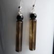 Kolczyki wykonane z prawdziwych topazów dymnych w kształcie podłużnych rurek, zwieńczone czarnymi onyksami. Wszystkie pozostałe elementy ze srebra próby 925. Proste, eleganckie, minimalistyczne.