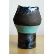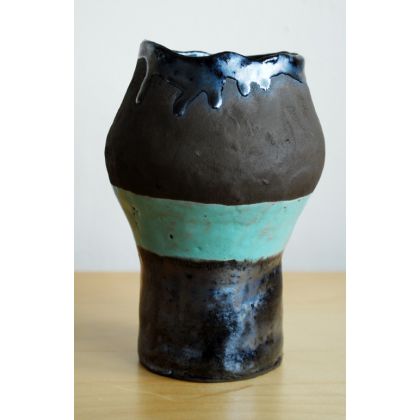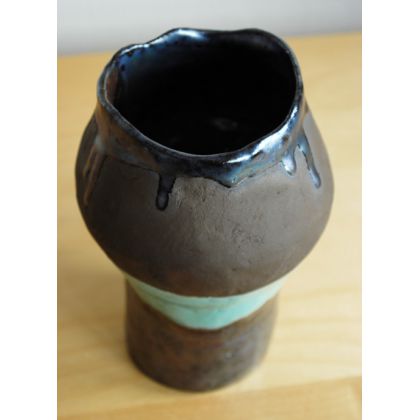 Oryginalny etniczny wazon na całkiem spory bukiet kwiatów. Wykonany z brązowej gliny pracochłonną techniką wałeczków, szkliwiony trzema rodzajami szkliw: turkusowym, opalizującym czarno-perłowym i od wewnątrz brązowym. Wypalony w temp. ok. 1100 st. C.