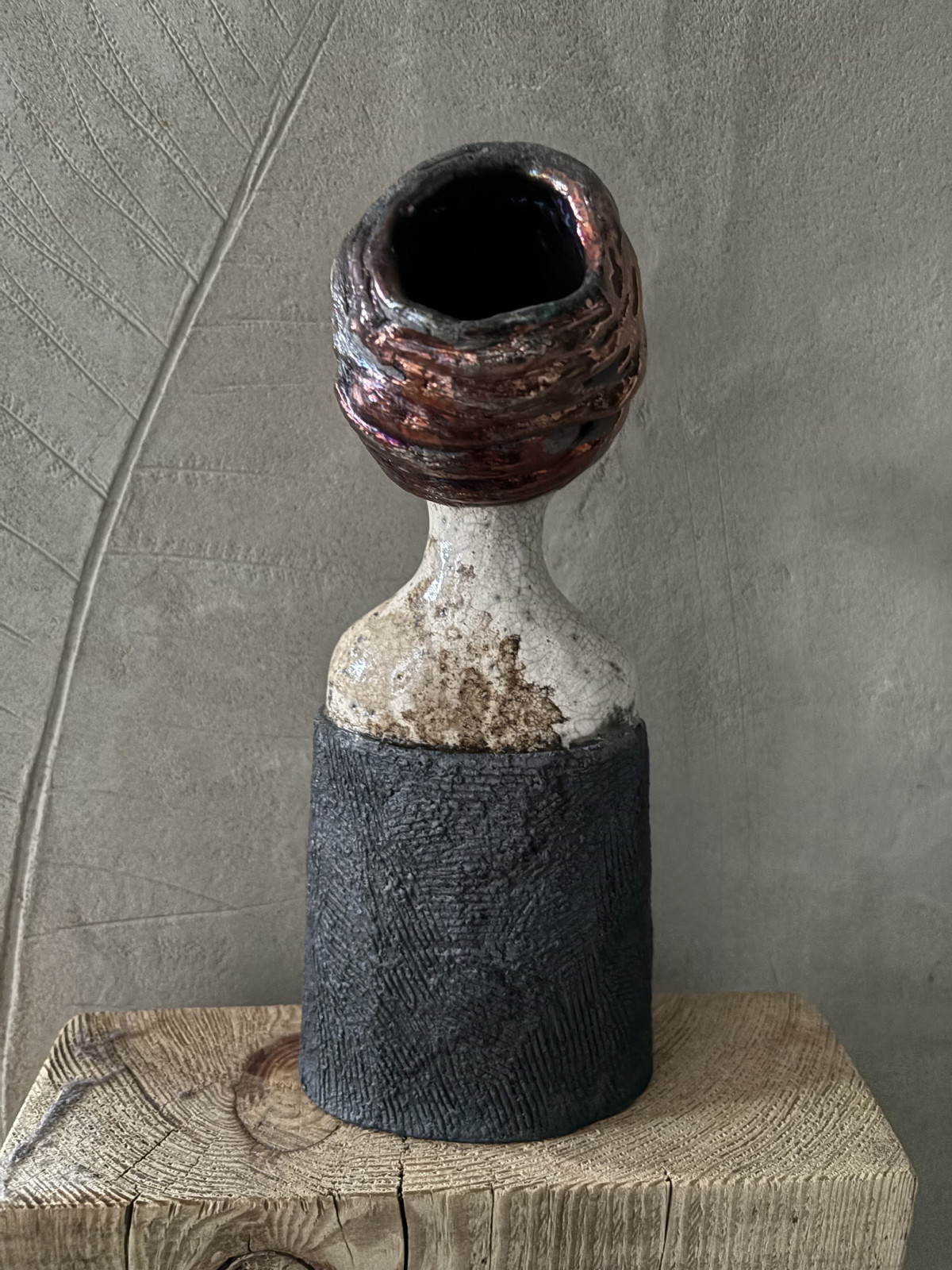 Wykonana ręcznie z gliny szamotowej, szkliwiona i wypalona w natywnej technice raku.