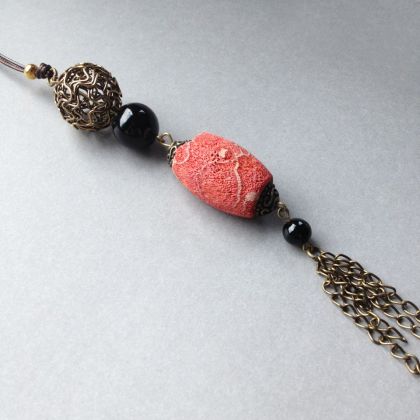 Unikatowy i oryginalny wisiorek. Na sznurku biżuteryjnym zawieszone zostały: szlifowany koral naturalny, onyksy i mosiężne ozdobne dodatki - całość zakończona ozdobnym chwostem z mosiężnych łańcuszków. Idealny do każdej stylizacji - optycznie wysmukla i wydłuża sylwetkę. Tylko jeden egzemplarz!
