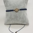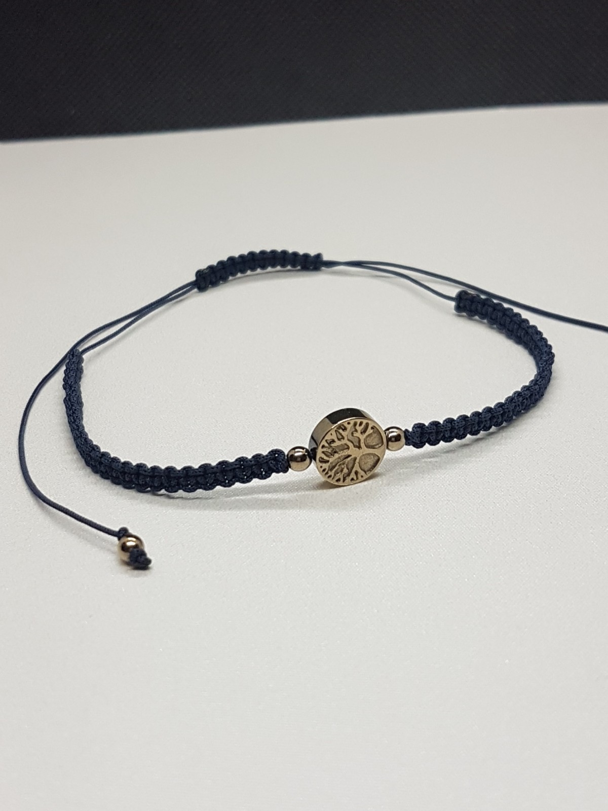 Bransoletka duża, męska, wypleciona ściegiem makramowym z granatowego sznurka jubilerskiego, wyplecione zapięcie pozwala na swobodną regulację. Głównym akcentem jest piękna moneta z drzewkiem szczęścia z hematytu w kolorze złotym.