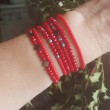 Zestaw siedmiu bransoletek z czerwonych koralików z małymi przekładkami z hematytu. Każdą bransoletkę można nosić oddzielnie lub komponować dowolnie z innymi bransoletkami. Bransoletki zrobione na sznurku jubilerskim, a zapięcie wyplecione sciegiem makramowym co pozwala na regulację objętości, przechodzi przed dłoń 22 cm, a zmniejszyć można do 13 cm objętości nadgarstka