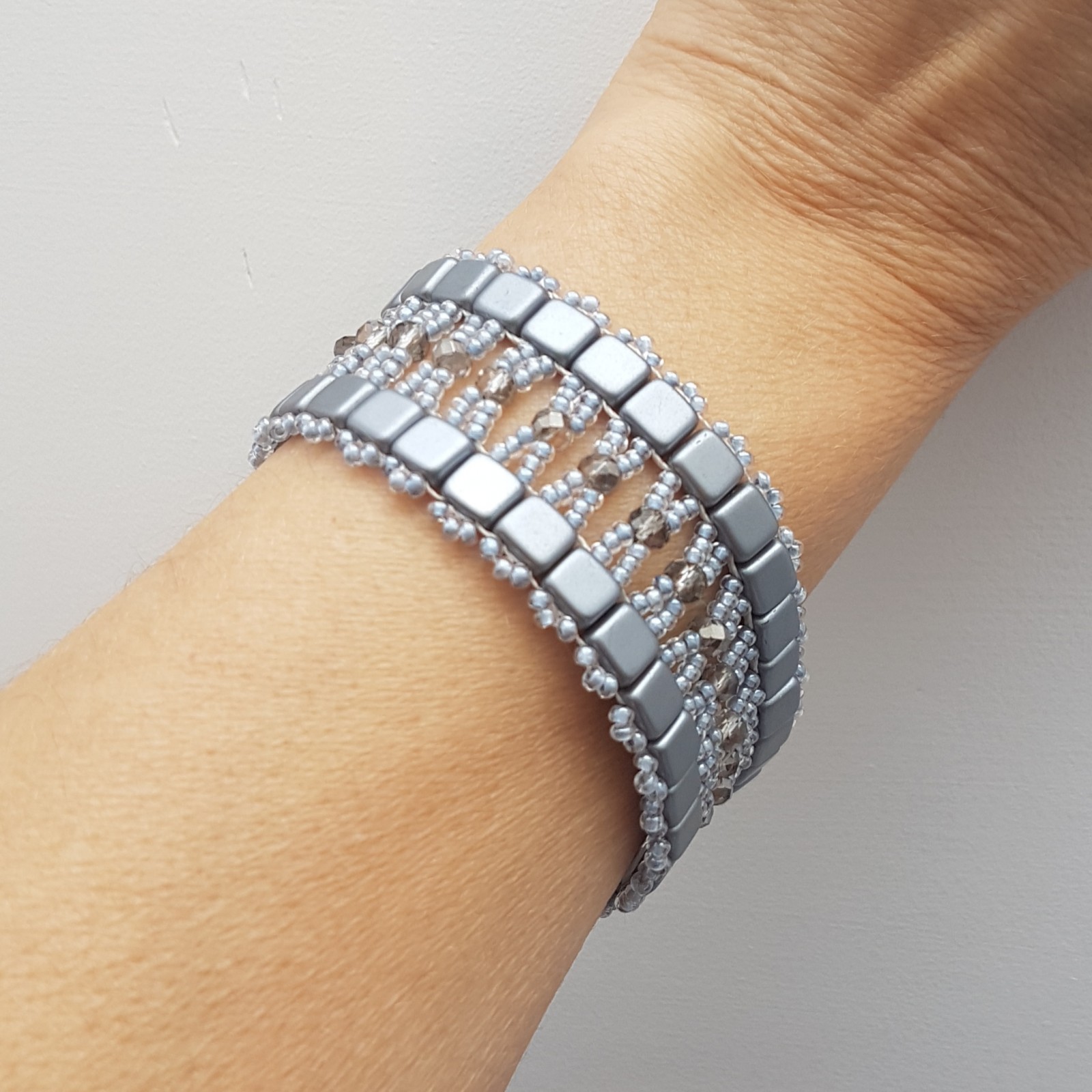 Srebrne kostki szklane w pięknym splocie z dodatkiem kryształków częściowo metalizowanych. Szerokość bransoletki 3 cm, długość 18-19 cm, zapięcie ze stali chirurgicznej, jest lekka, efektowna.