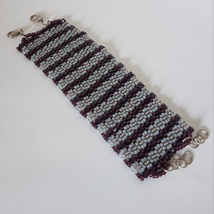 Szeroka fioletowo perłowa bransoletka, elegancki dodatek biżuteryjny, duża, z duzą ilością koralików bardzo drobnych i fioletowych kryształków szklanych. Szerokość bransoletki wynosi 5 cm, długość 17-19 cm, zapięcie stal chirurgiczna,