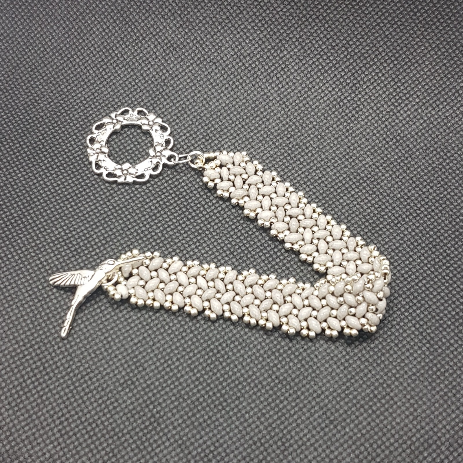 Bransoletka z ptaszkiem, wypleciona z szarych i srebrnych koralików. Zapięcie metalowe typu toogle, bez regulacji. Delikatna bransoletka, kolor pasujący na każdą okazję i do każdej kreacji. Szerokość bransoletki 1,7 cm objętość 17 cm