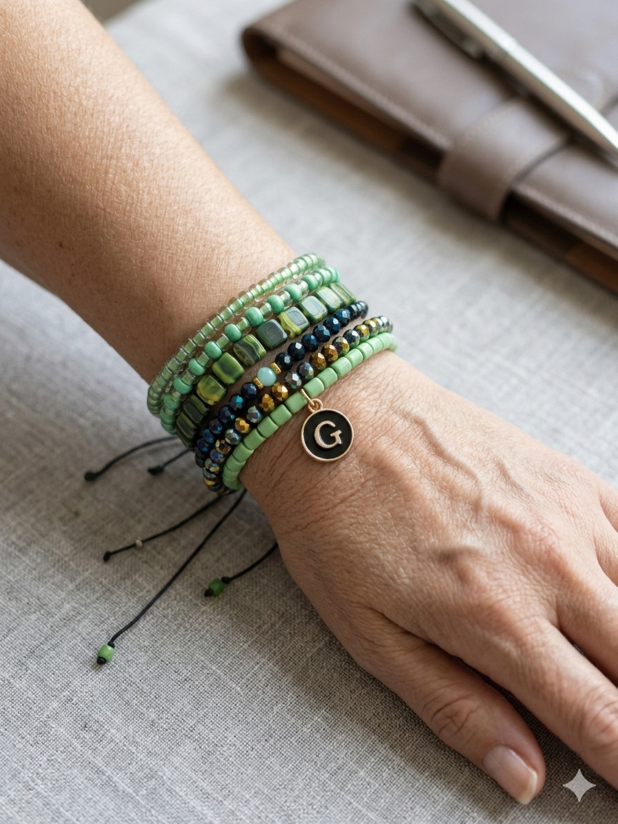 Dodaj swojej stylizacji wyjątkowego charakteru dzięki naszemu zestawowi pięciu ręcznie komponowanych bransoletek. Połączenie soczystej zieleni, głębokiego granatu i złotych akcentów tworzy harmonijną całość, która przyciąga wzrok i pasuje zarówno do codziennych, jak i eleganckich zestawów.