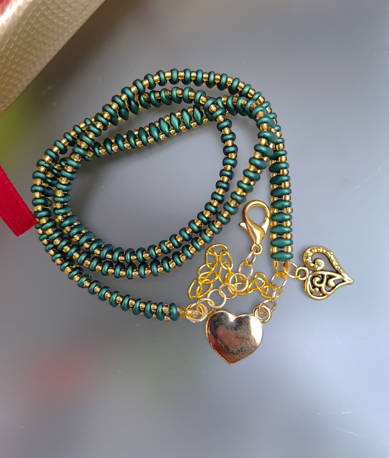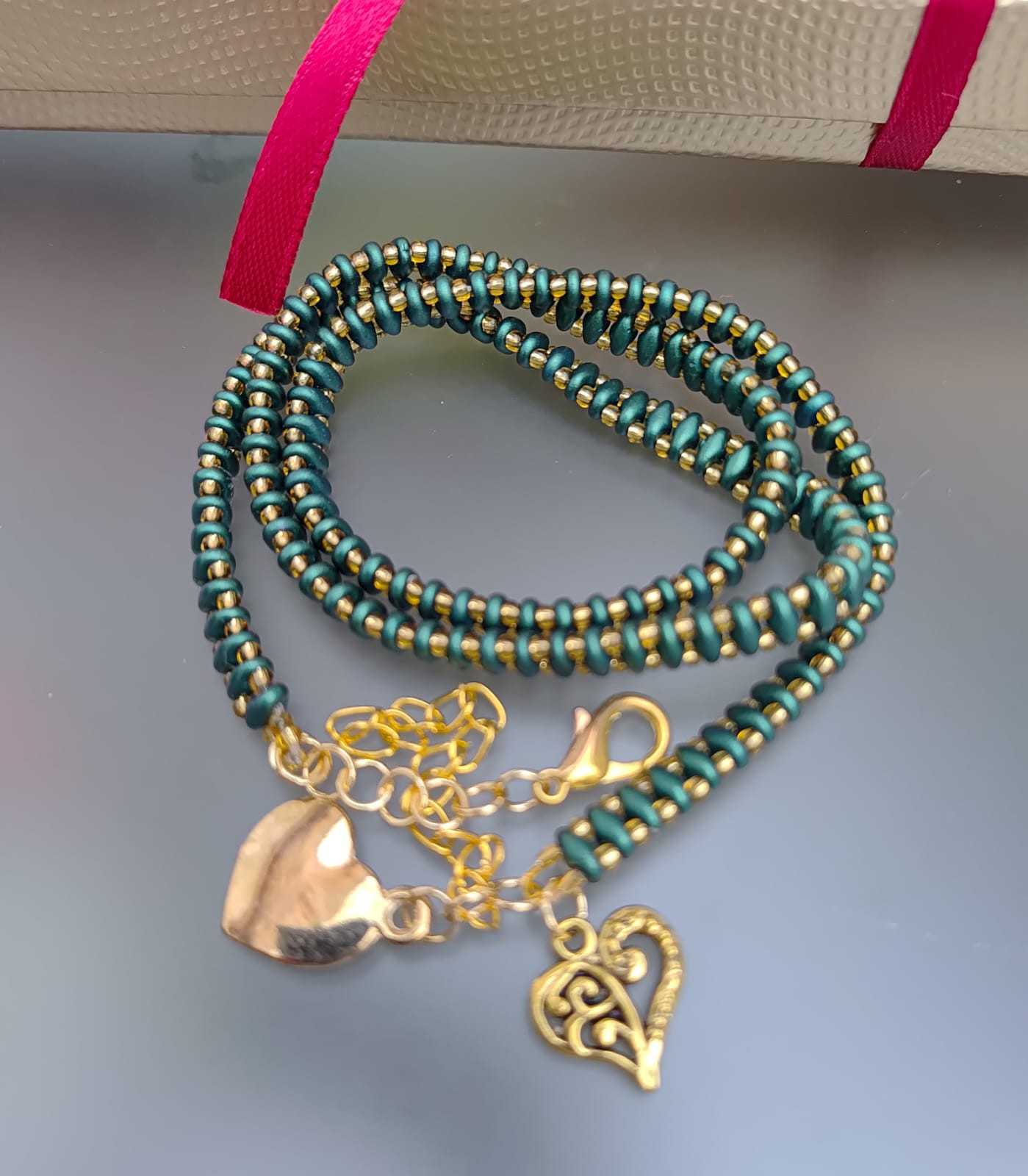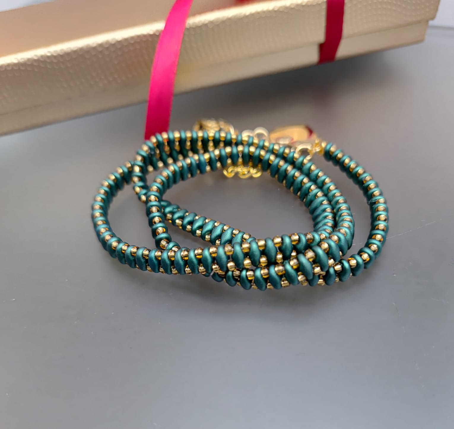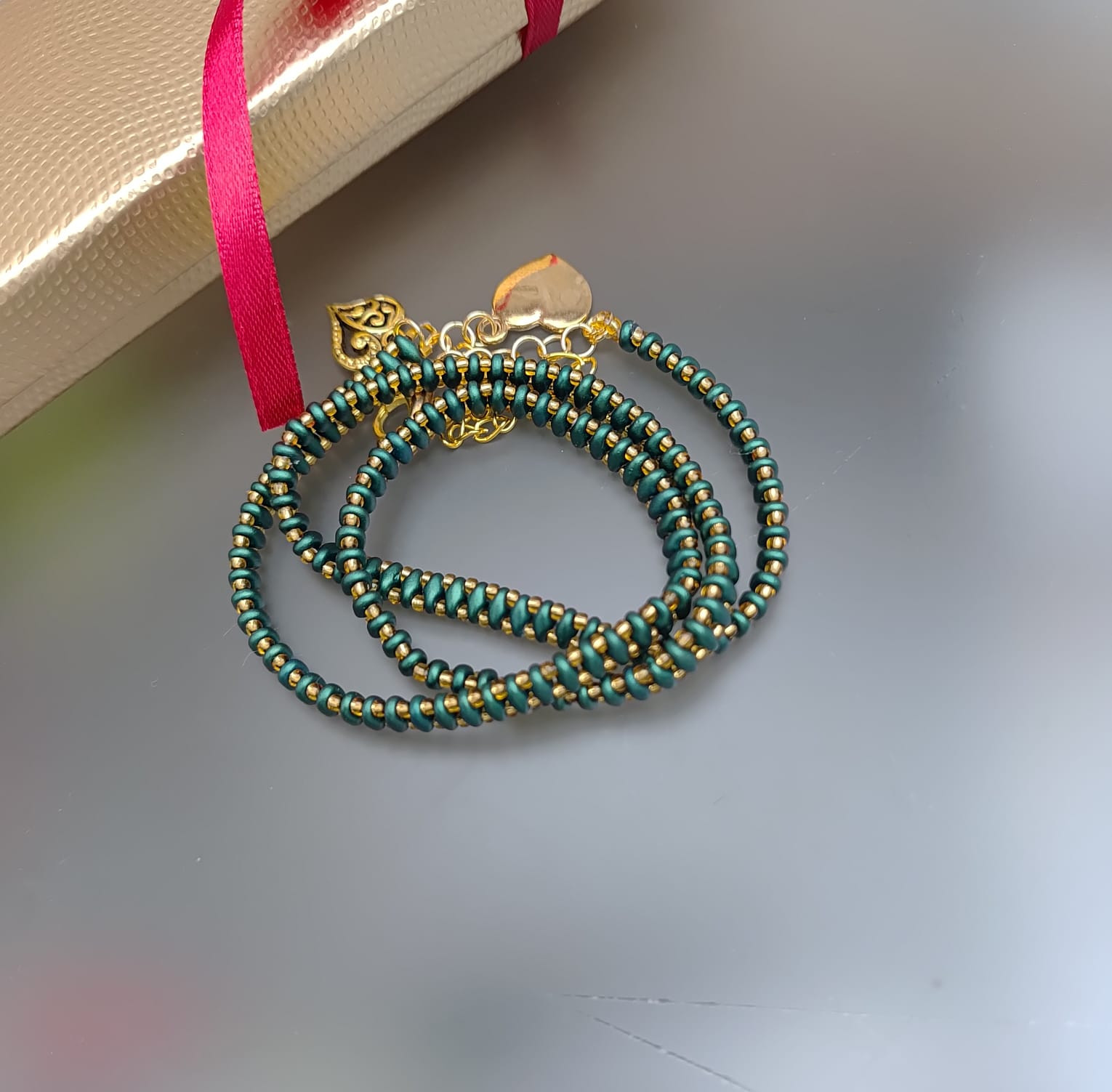 Bransoletka z pieknych szmaragdowych koralików szklanych. Bardzo długa żmijka z koralików, którą można trzykrotnie owinąc wokół nadgarstka. Szkło, metal,