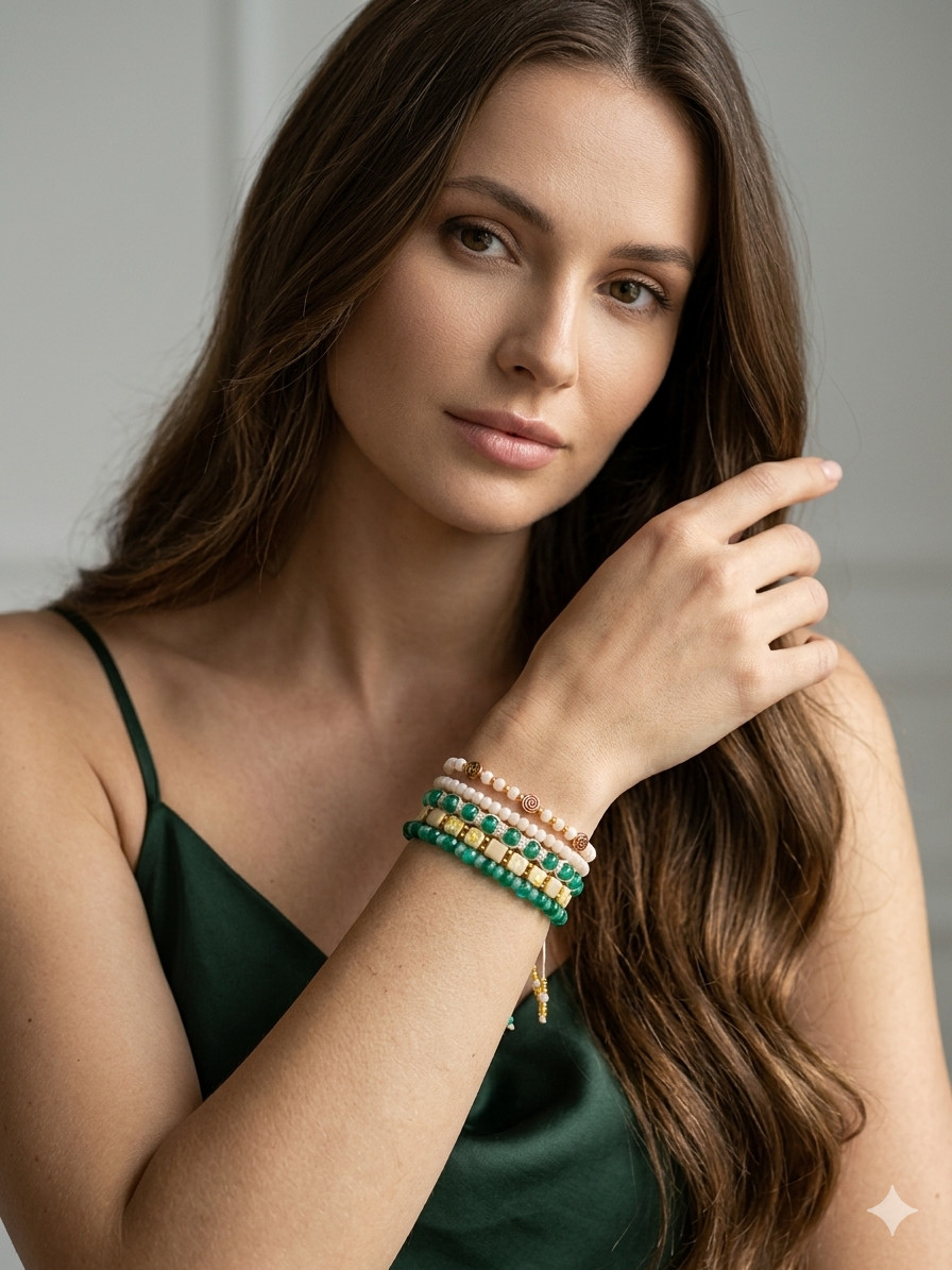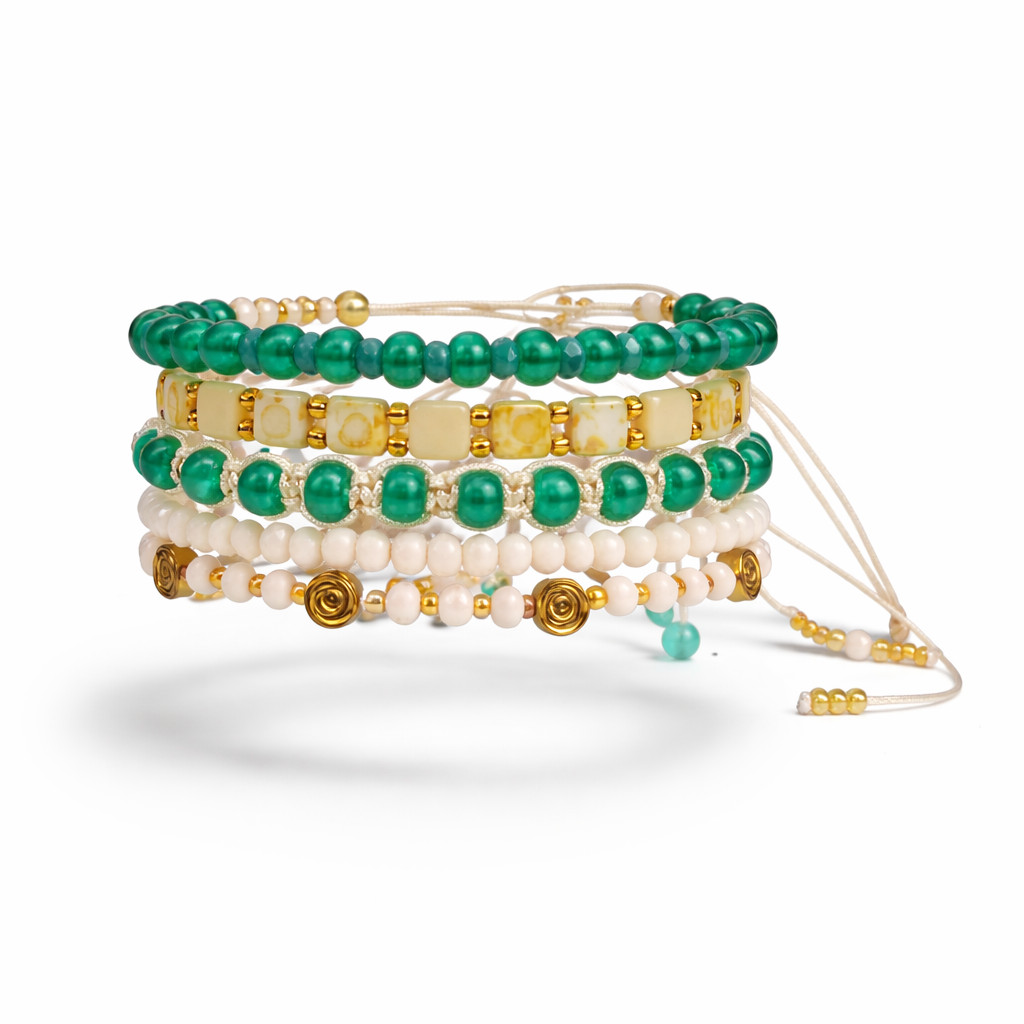 Subtelny zestaw czterech ręcznie plecionych bransoletek na sznurku, łączący soczystą zieleń szklanych koralików z beżowymi, kwadratowymi akcentami o etnicznym wzorze. Całość dopełniają delikatne koraliki kryształki fasetowane oraz eleganckie, złocone różyczki z hematytu. Idealny dodatek do codziennych i boho stylizacji. Objętość regulowana.
