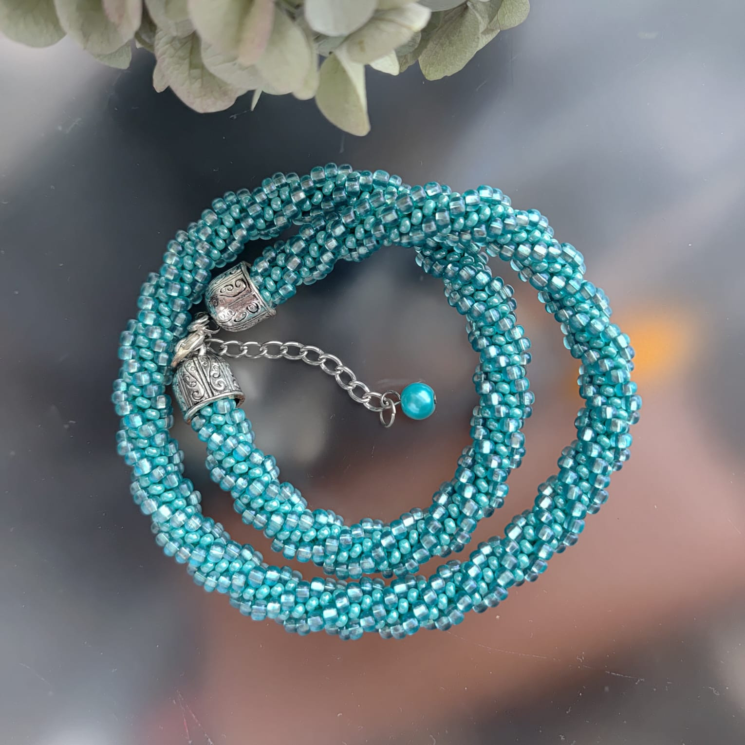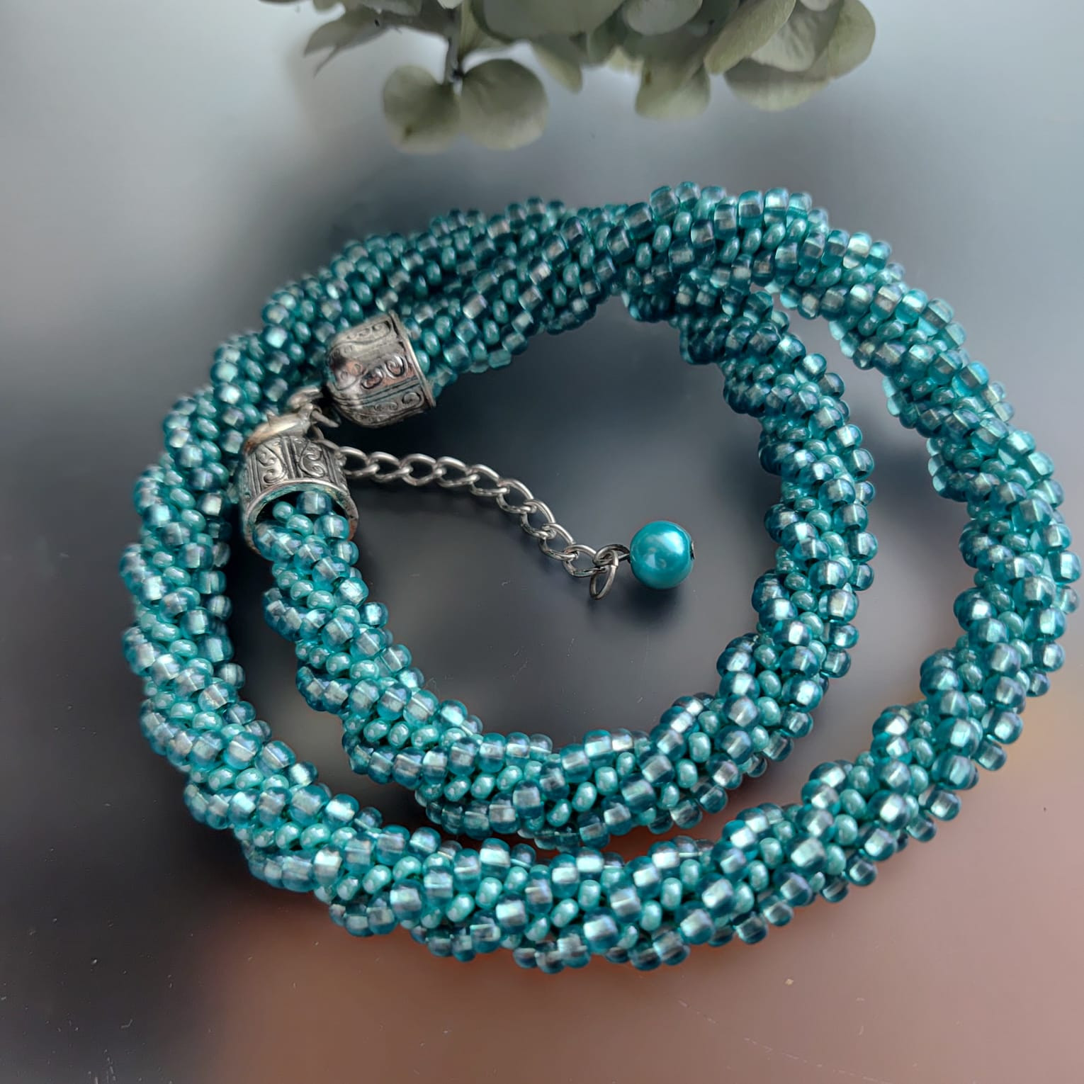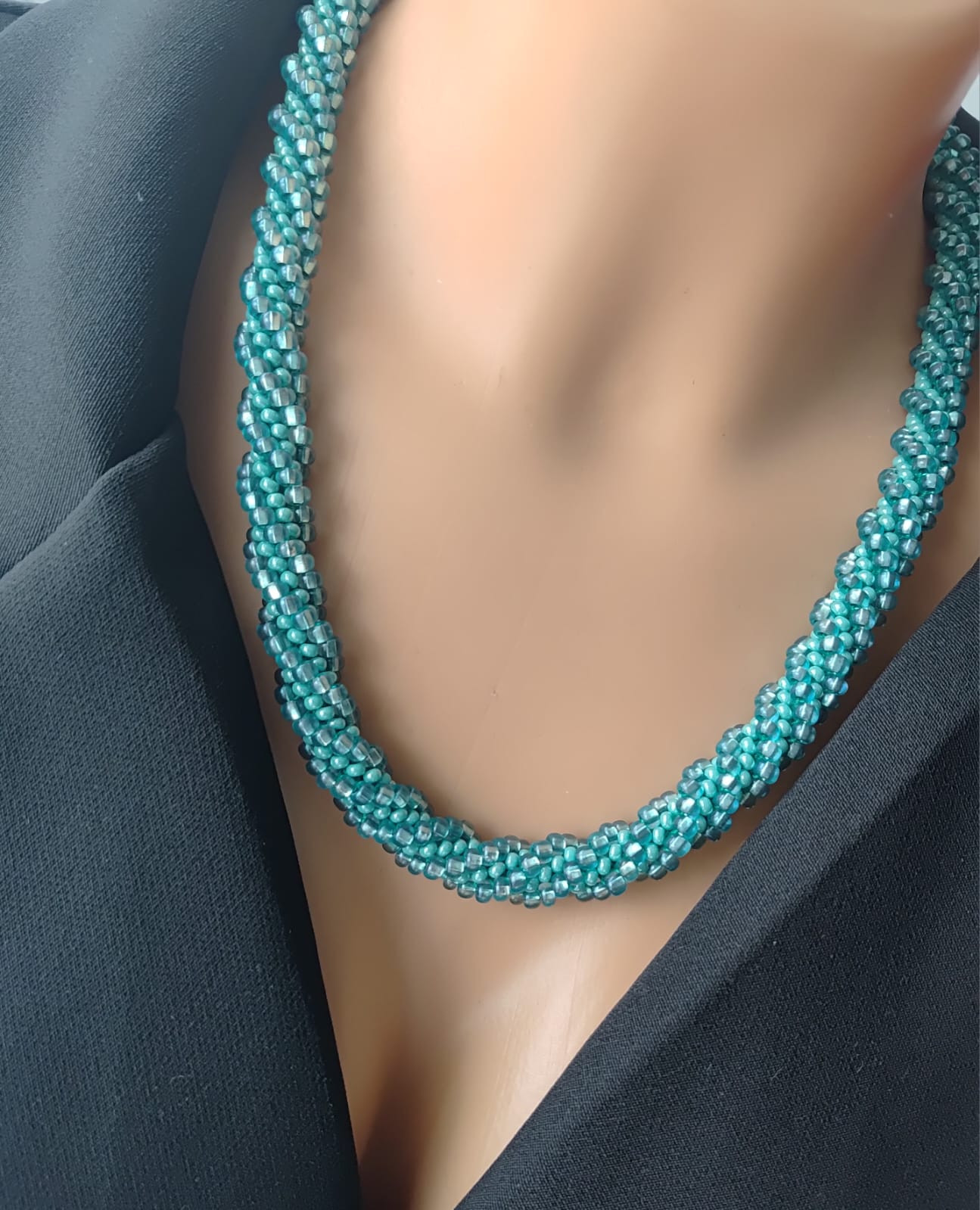 Sznur wypleciony z koralików szklanych. Piękne błyszczące koraliki w dwóch rozmiarach stworzyły ładną spiralę. Koraliki maja delikatny turkusowy kolor. Końcówki ozdobne metalowe i zapięcie ze stali nierdzewnej. Długość sznura całkowita od zapiecia do zapięcia wynosi 52 cm i łańcuszek 4 cm
