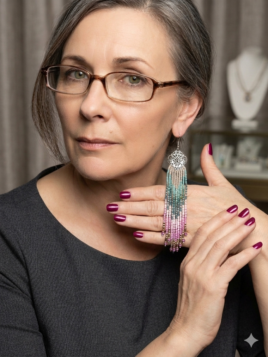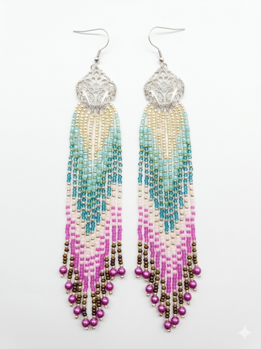Efektowne, ręcznie plecione kolczyki wiszące, które zachwycają precyzją wykonania i płynnym przejściem barw. Ażurowe zdobienie w kolorze srebra łączy się z dziesiątkami drobnych koralików w odcieniach turkusu, pudrowego różu i nasyconej fuksji.