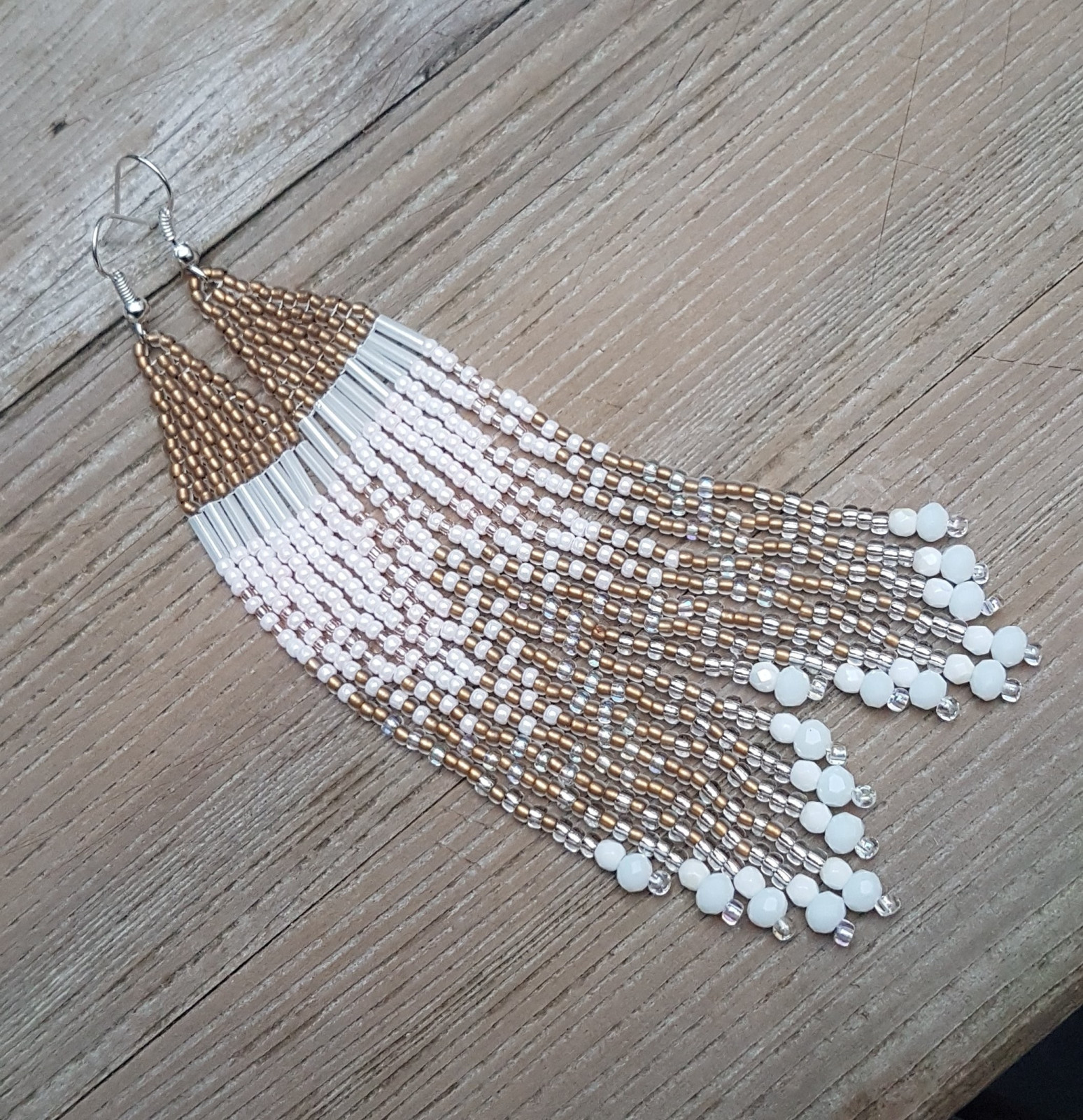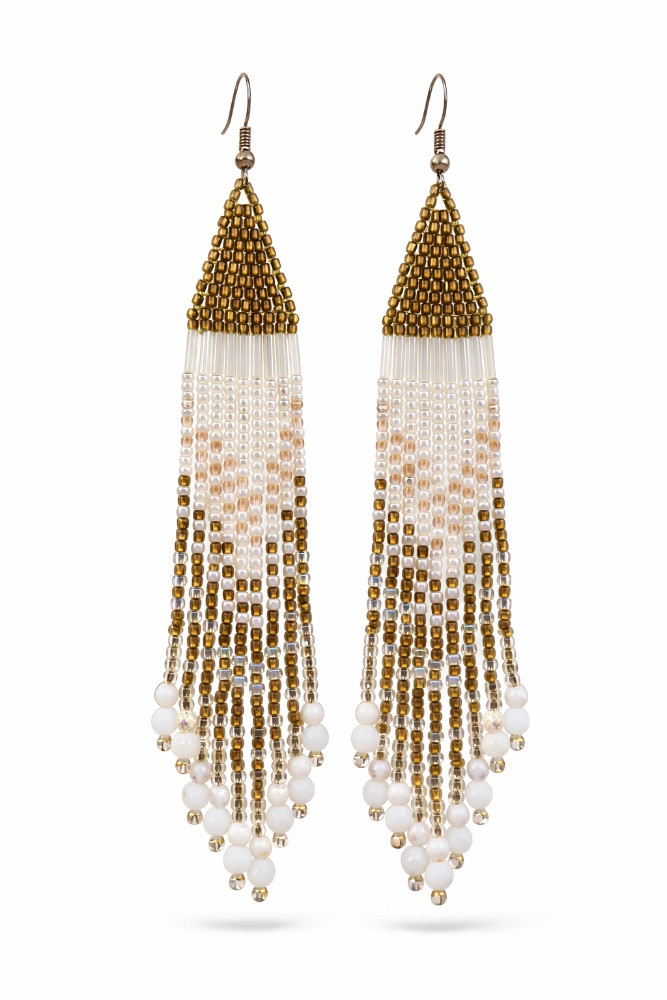 Długie kolczyki boho z koralików - biało-złote kaskady