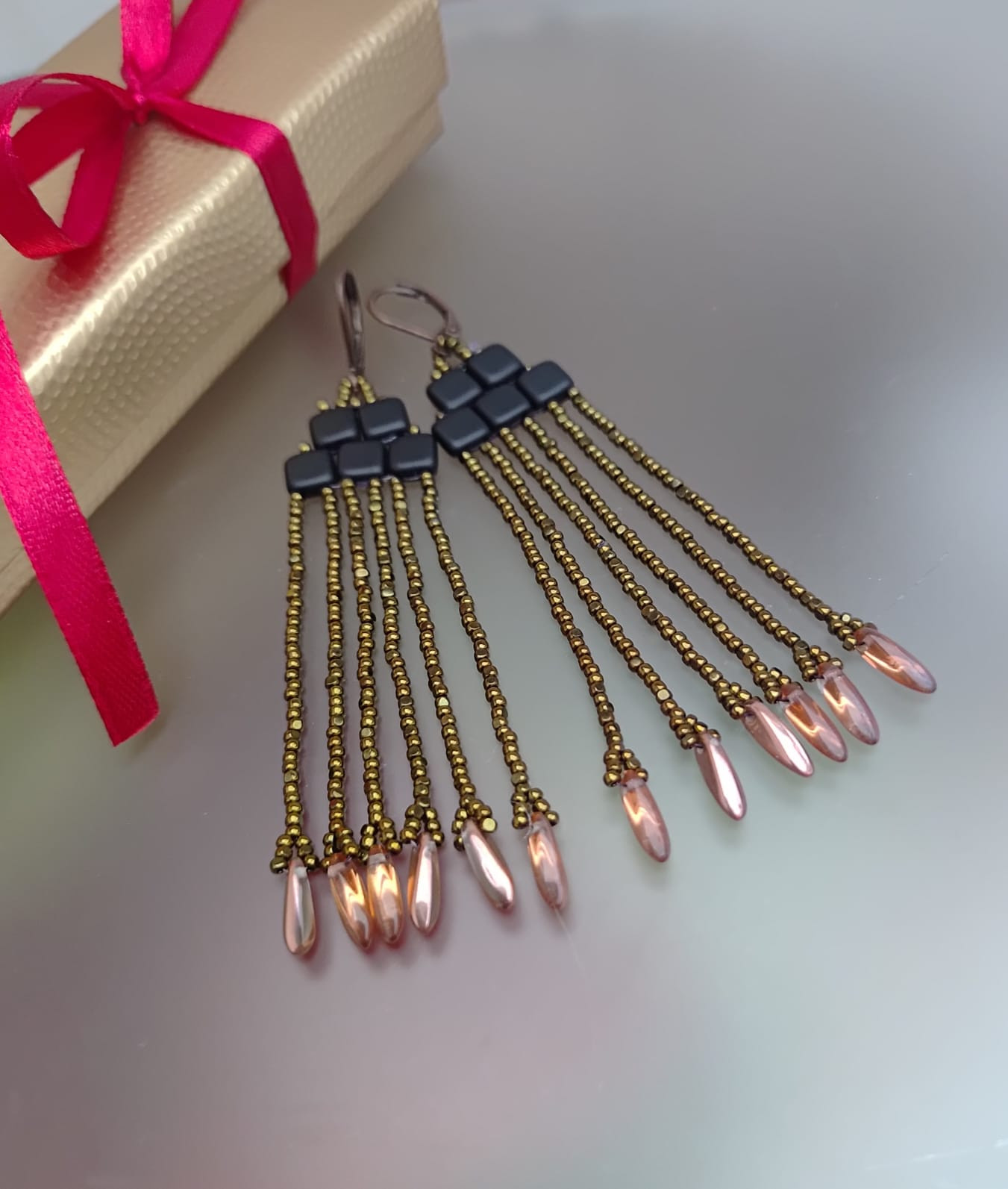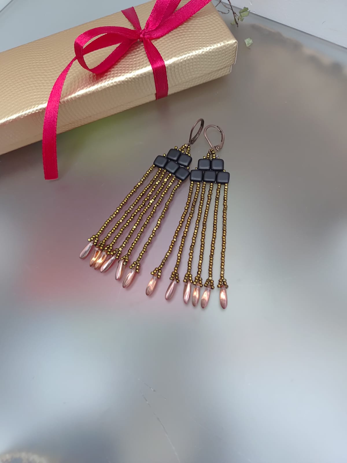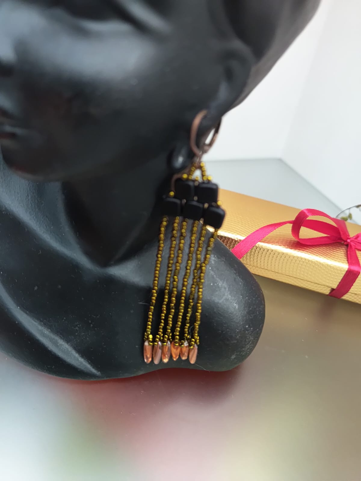 Kolczyki czarne z domieszka starego złota, frędzle krótkie, lekkie, delikatne, efektowne. Długość kolczyka z biglem 6,5 cm