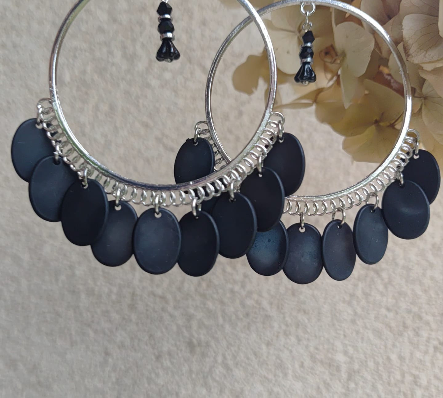 Kolczyki Na metalowej bazie koraliki płaskie oliwki czarne akrylowe lekkie i kwatek, oponki szklane , przekładki hematyt. Średnica koła 6 cm, bigle stal, baza kolczyka to gotowy produkt metalowy. Długość kolczyka z biglem 10 cm
