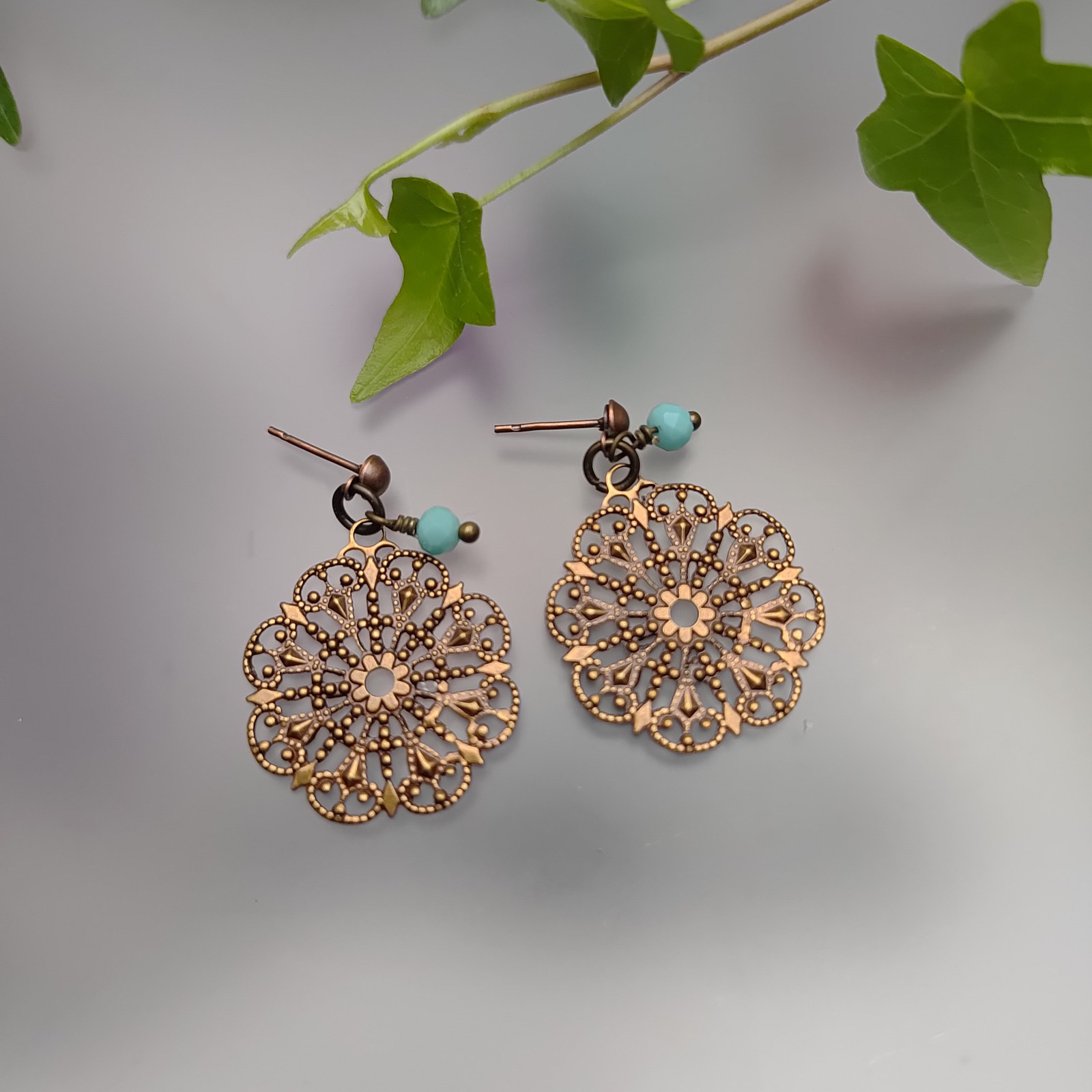 Kolczyki z mosiężnych filigranów w kształcie małych mandali. Średnica mandali 2,5 cm, sztyft metalowy w kolorze miedzi, Długość z biglem 3 cm, szklany koralik w kolorze turkusowym, do sztyftów baranki silikonowe