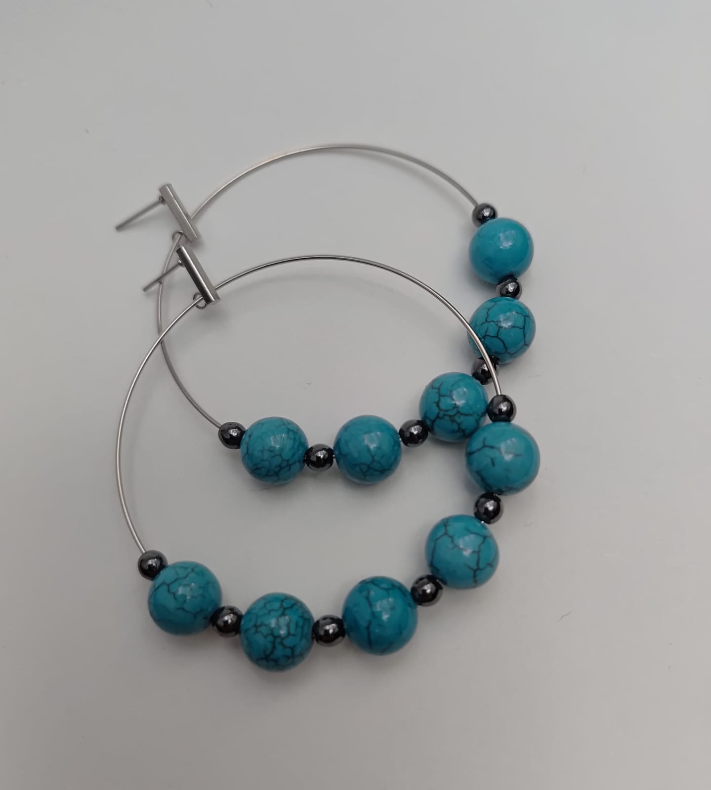 Kolczyki wiszące koła duże z koralików hematytu i howlitu w kolorze niebieskiego turkusu. Średnica koła 5,5 cm, Długość z biglem 6 cm, bigiel mały w kolorze srebrnym ze stali nierdzewnej.