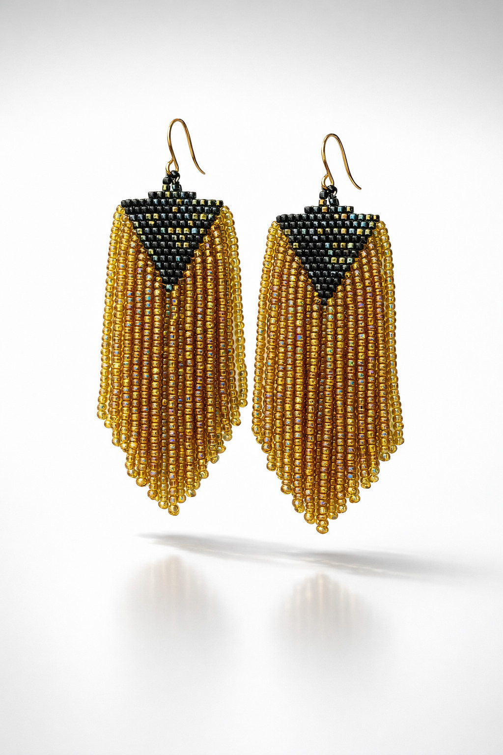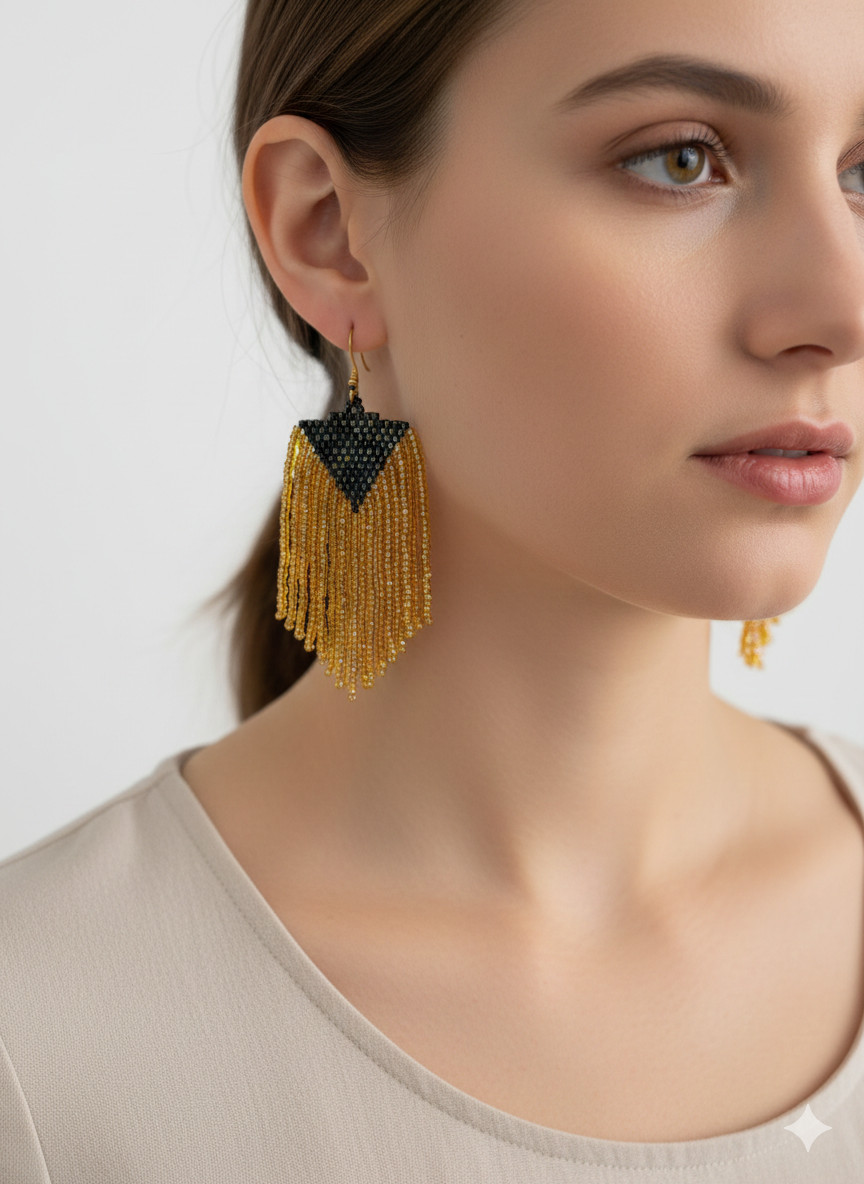 Kolczyki, które łączą w sobie nowoczesny blask z elegancką formą. Dominują tu koraliki w odcieniu głębokiej, metalizowanej zieleni, która pięknie mieni się przy każdym ruchu głowy, dając efekt benzynki lub szmaragdowego lustra. Przeplatają się one z koralikami w kolorze klasycznego złota, które rozświetlają kompozycję i nadają jej luksusowego charakteru. Wykończone są na dole drobnymi gęstymi frędzelkami, które dodają im dynamiki mimo krótkiej formy.