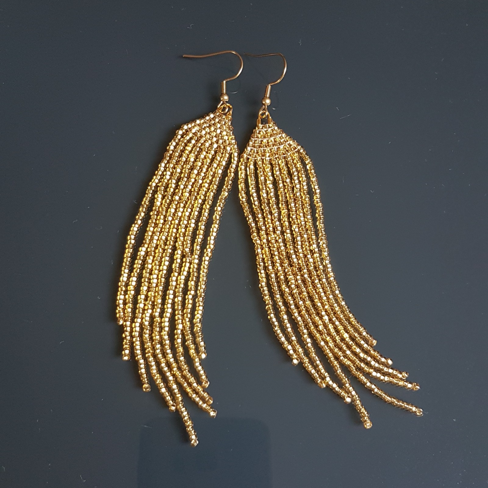 Kolczyki z pięknych szklanych, złotych, błyszczących koralików. Koraliki odbijaja światło. Doskonały dodatek na wieczór i na każdy dzień dla wielbicielek złota zawsze i wszędzie. Dodadzą blasku najskromniejszej kreacji. Długosć 12 cm, bigle ze stali chirurgicznej.