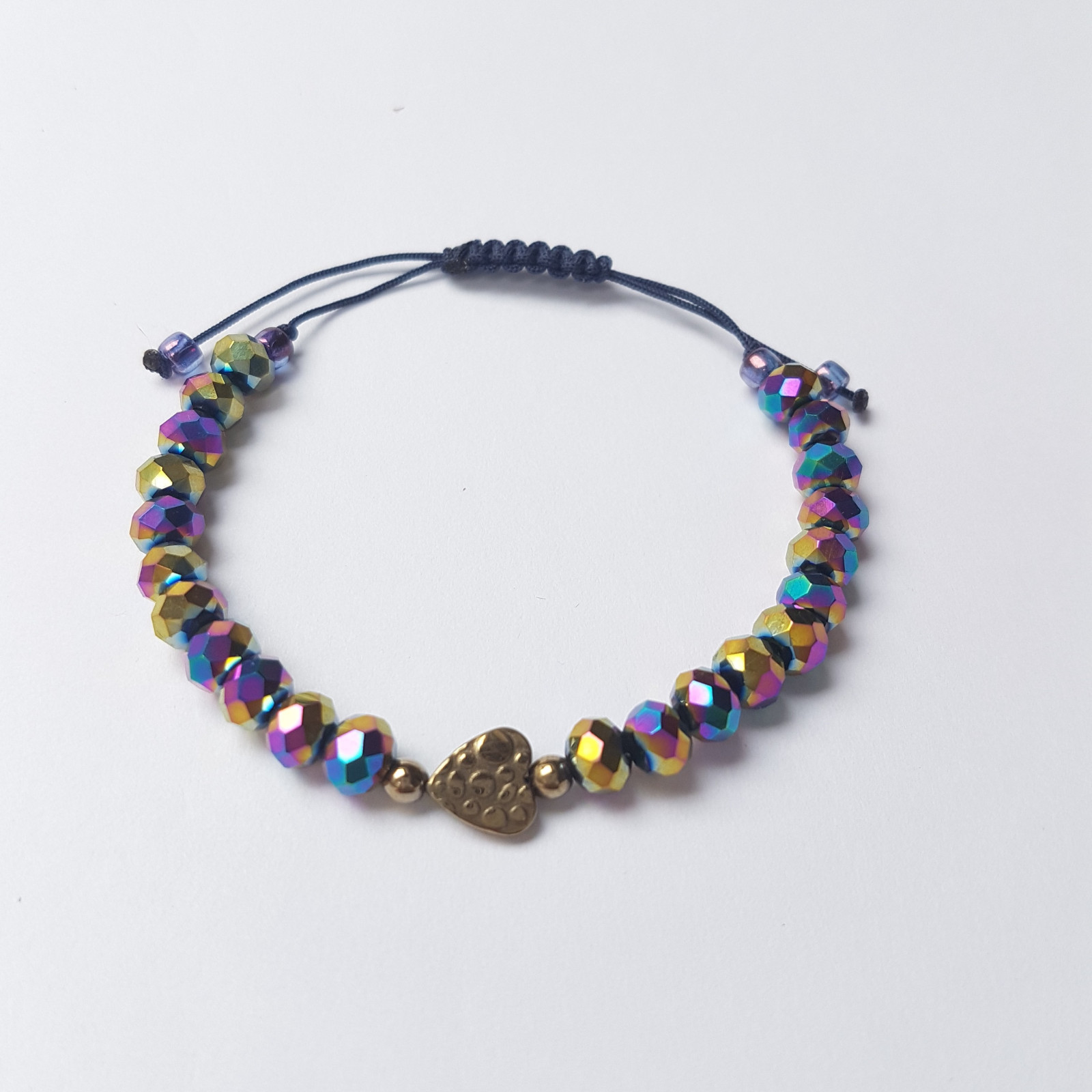 Zestaw siedmiu bransoletek z fioletowych koralików z przekladkami z hematytu w kolorze zlotym. Każdą bransoletkę można nosić oddzielnie lub komponować dowolnie z innymi bransoletkami. Bransoletki zrobione na sznurku jubilerskim, a zapięcie wyplecione ściegiem makramowym co pozwala na regulację objętości, przechodzi przed dłoń 21,5 cm, a zmniejszyć można do 13 cm objętości nadgarstka