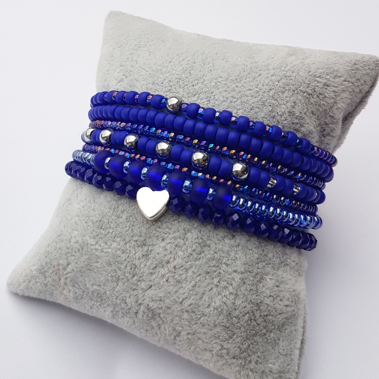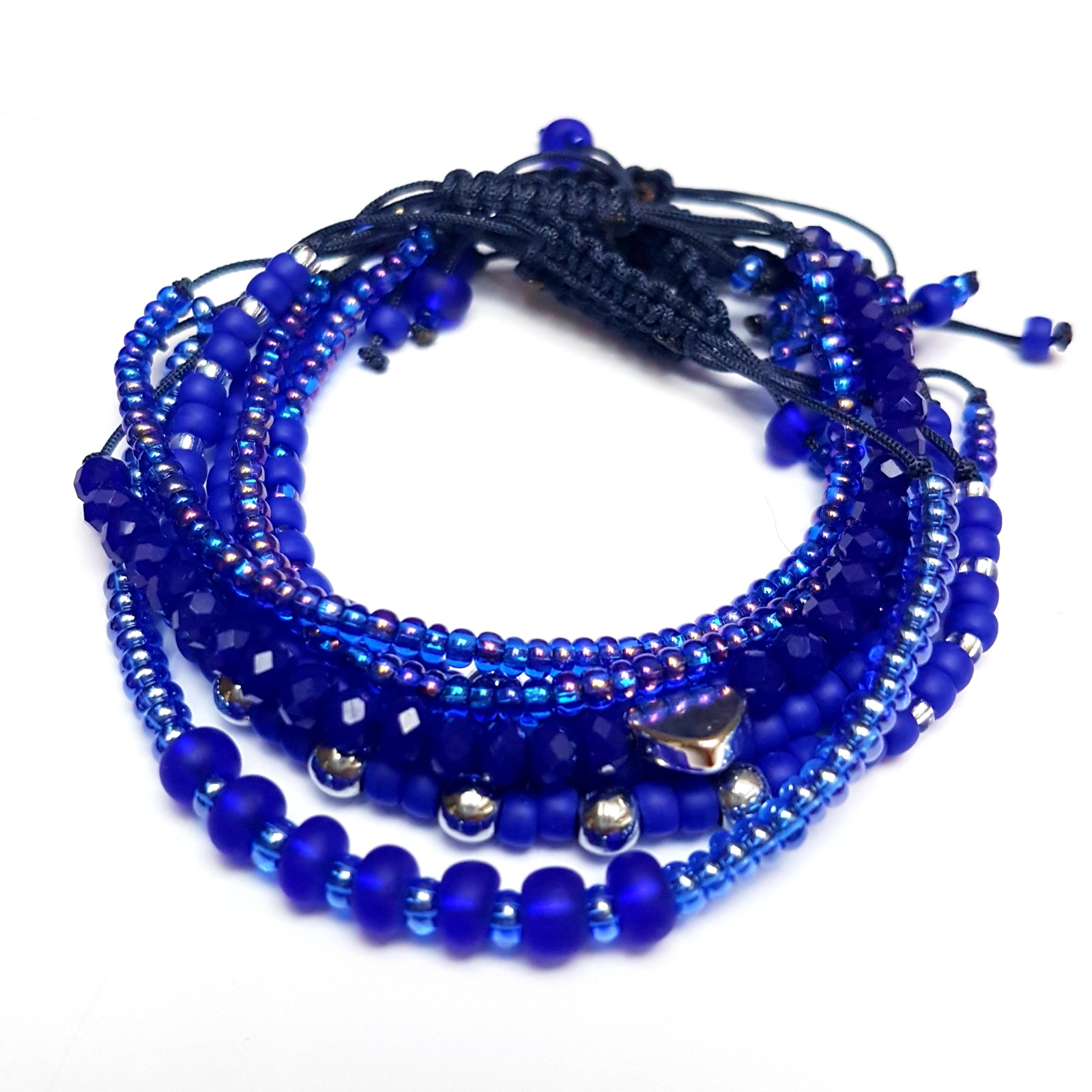 Zestaw siedmiu bransoletek z granatowych koralików z przekładkami z hematytu w kolorze srebrnym. Każdą bransoletkę można nosić oddzielnie lub komponować dowolnie z innymi bransoletkami. Bransoletki zrobione na sznurku jubilerskim, a zapięcie wyplecione ściegiem makramowym co pozwala na regulację objętości, przechodzi przed dłoń 20 cm, a zmniejszyć można do 12 cm objętości nadgarstka
