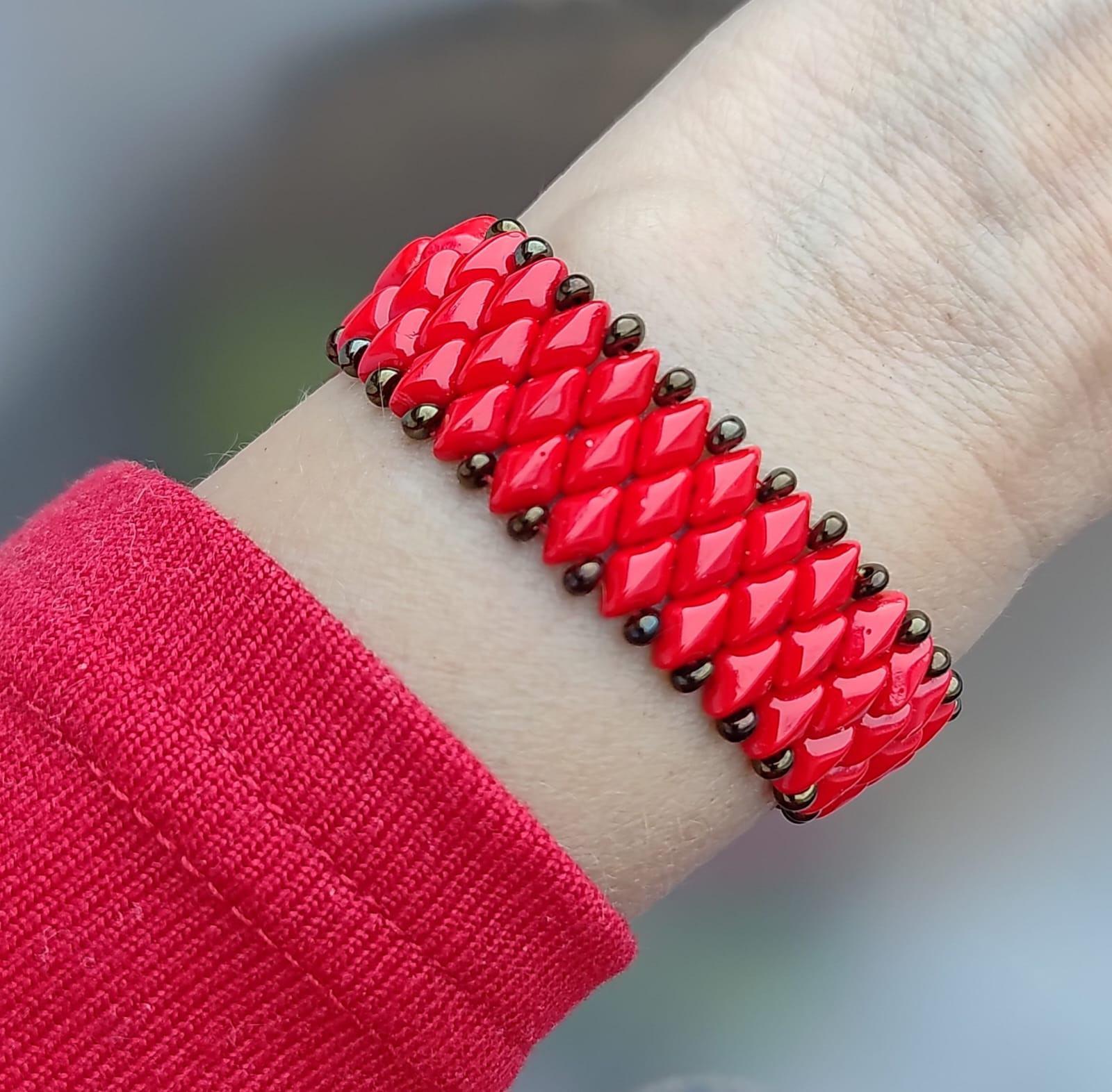 Bransoletka na sznurku syntetycznym. Piękne mocno czerwone koraliki o ciekawym kształcie stworzyły szeroka bransoletkę. Sznurek pozwala na dopasowanie do każdego nadgarstka.