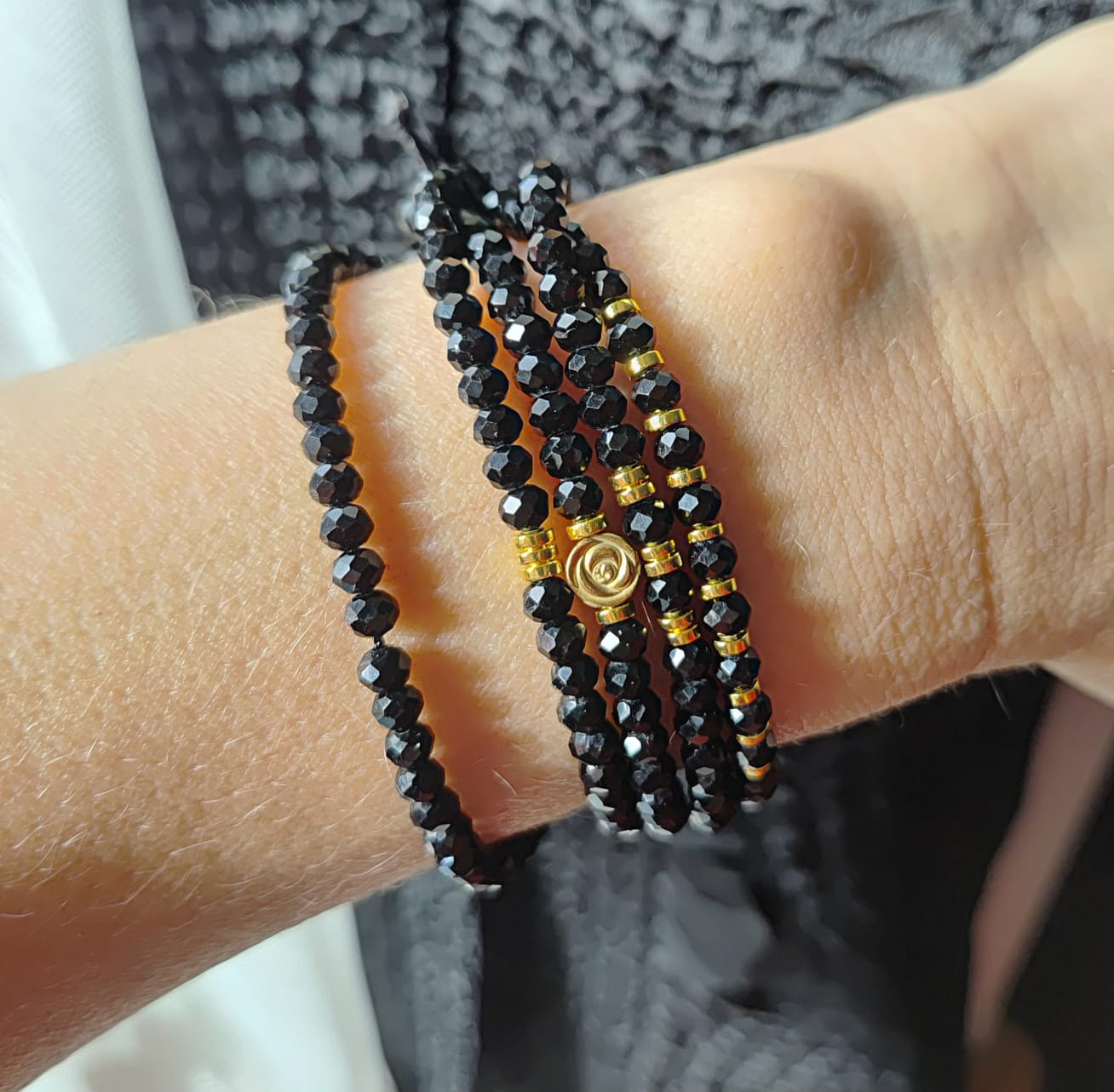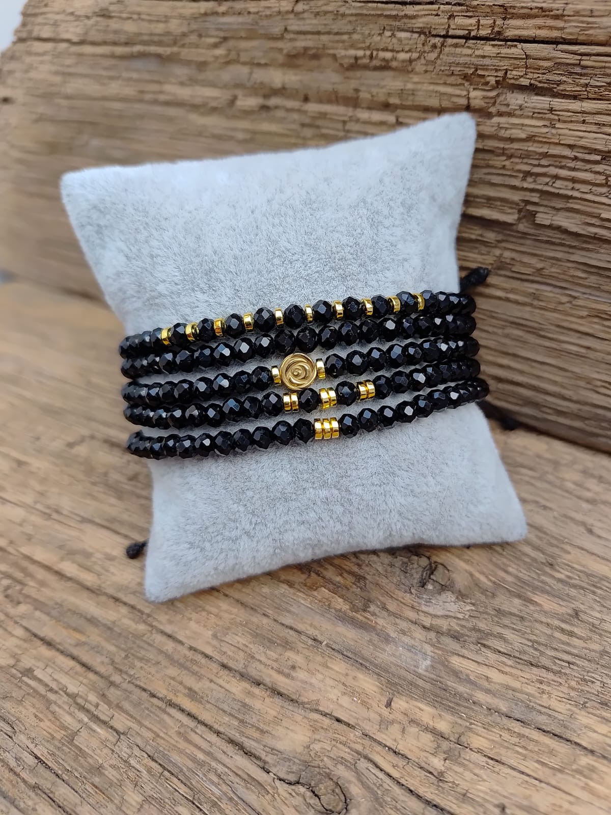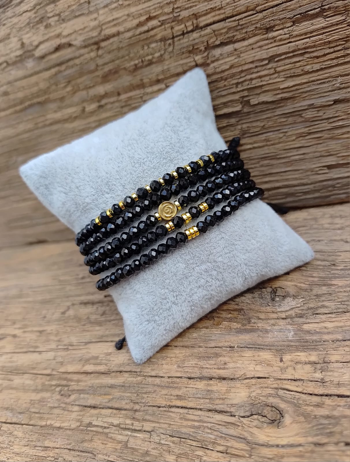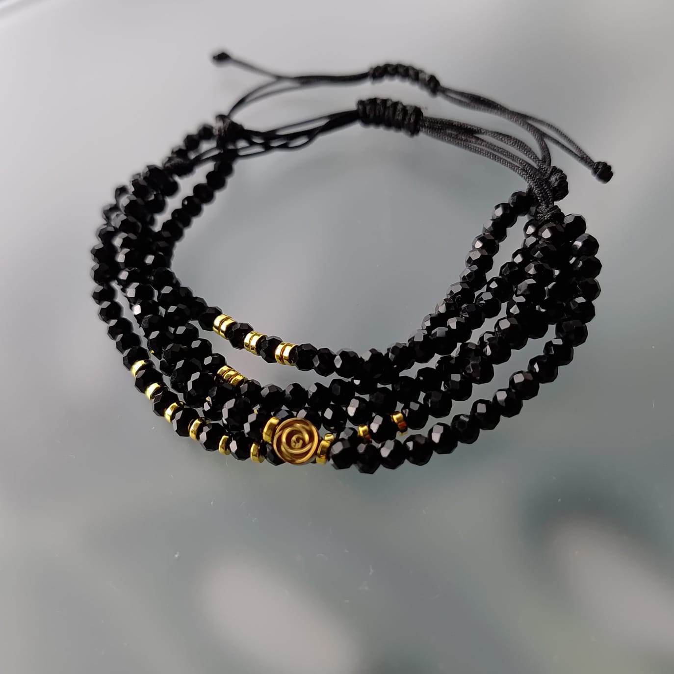 Bransoletka na sznurku syntetycznym czarnym. Pięć sznureczków zebranych w dwie oddzielne bransoletki. Każdą można nosić oddzielnie. Czarne kryształki i przekładki hematytu w kolorze złotym. Największy obwód po rozciągnięciu wynosi 21 cm