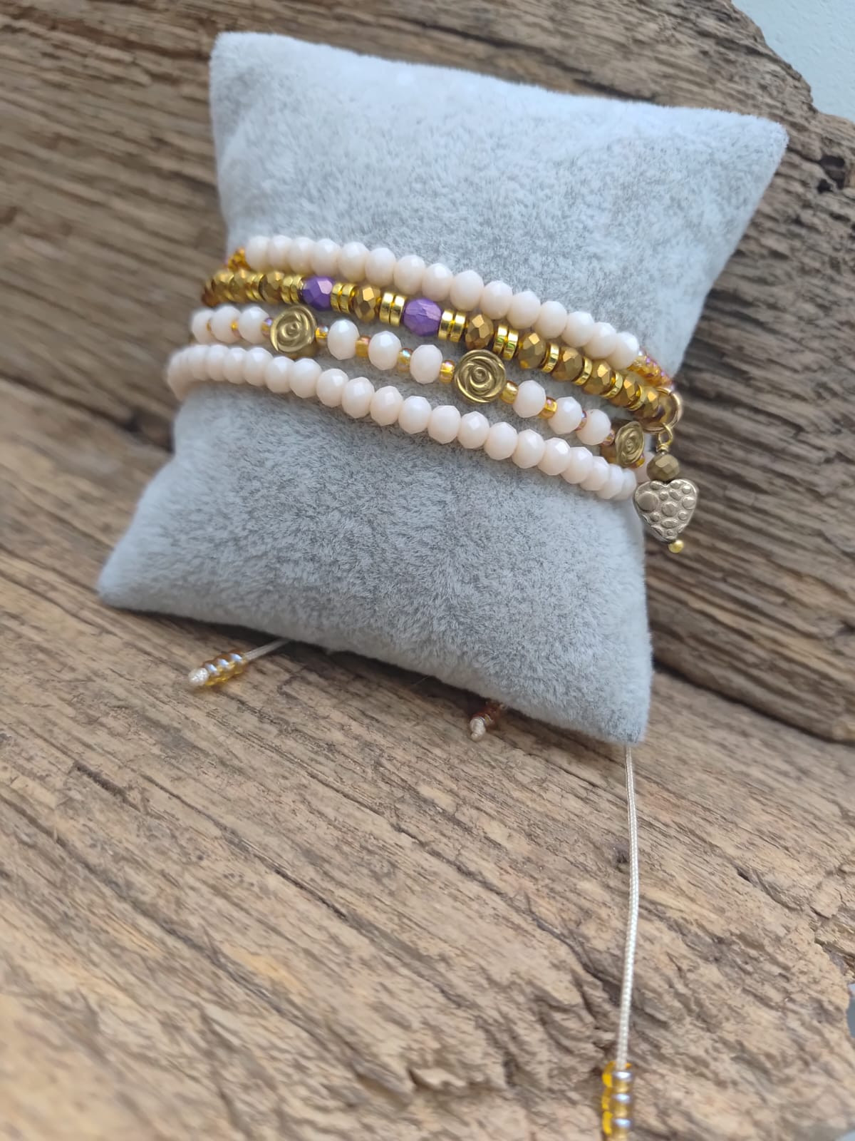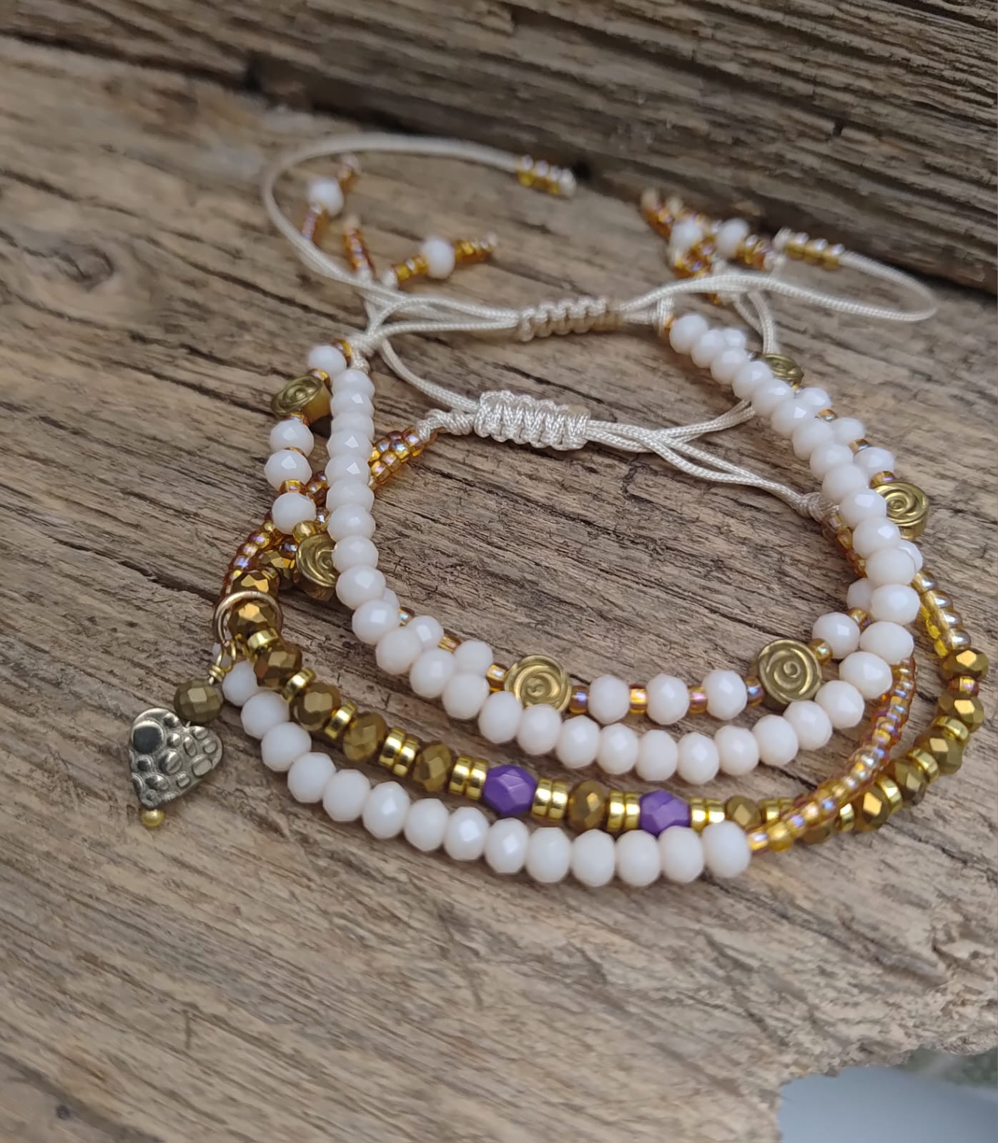 Bransoletka na sznurku syntetycznym. Koraliki oponki szklane fasetowane nude, złote drobne koraliki i przekładki z hematytu, różyczki i serduszko zawieszka. Sznurek pozwala na dopasowanie, największy obwód 20 cm