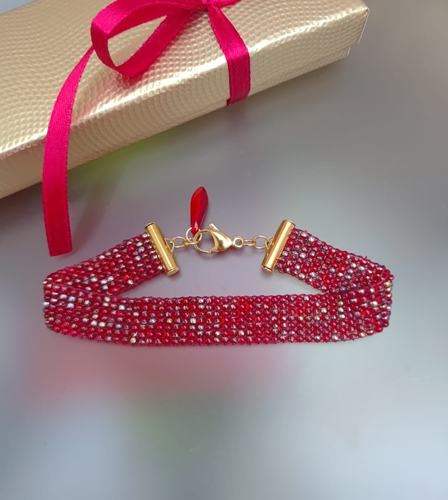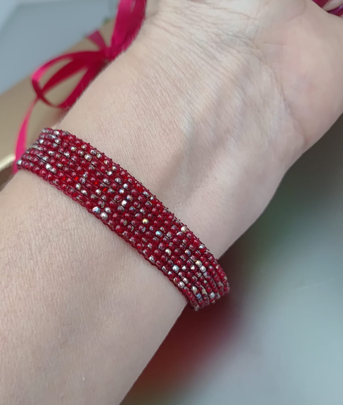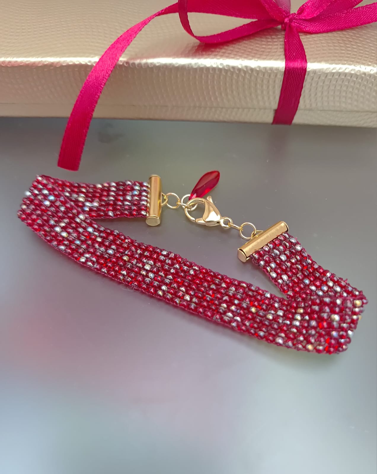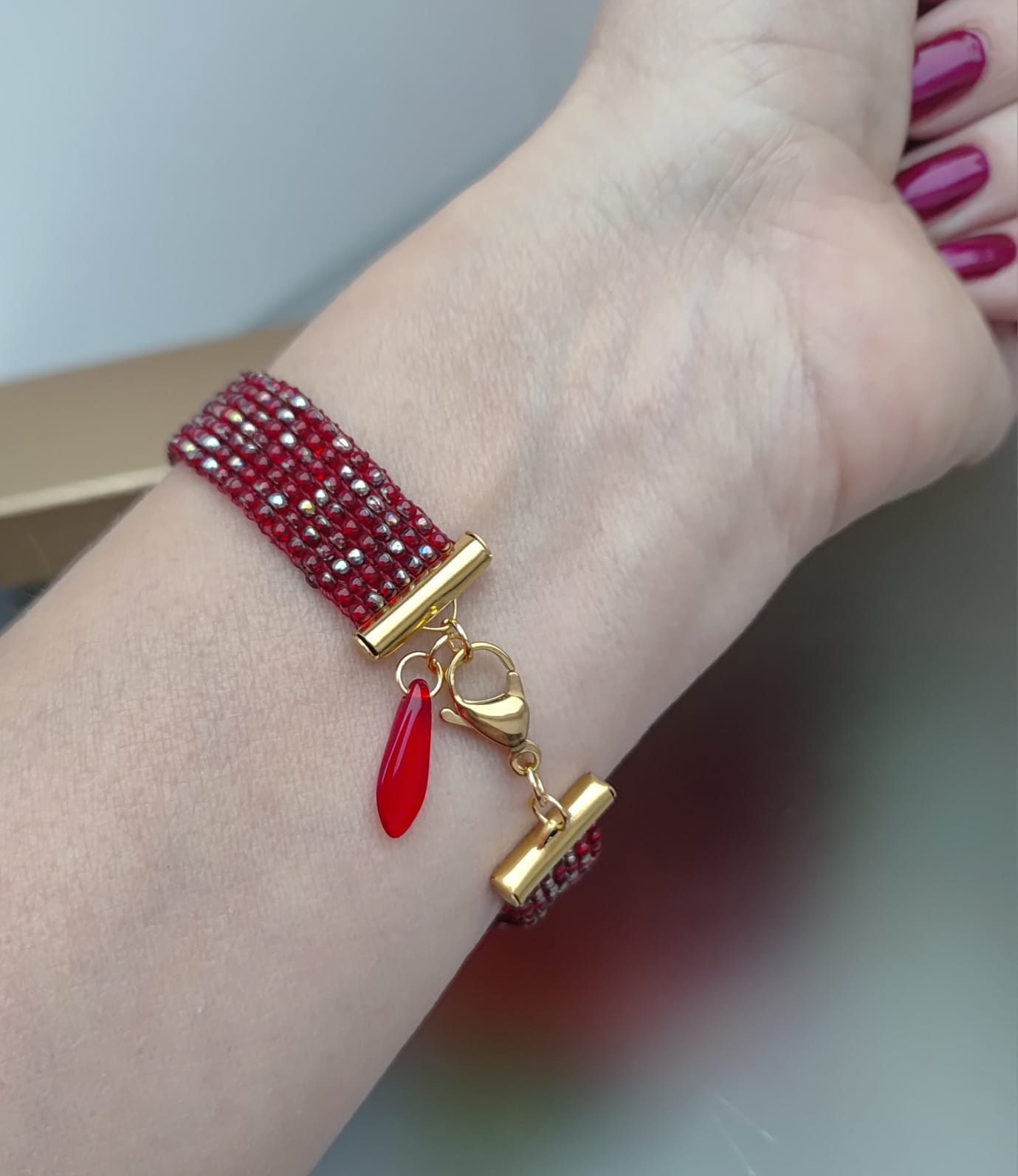 Bransoletka utkana na krośnie z ciemno czerwonych koralików częściowo metalizowanych. Szerokość bransoletki 14 mm, długość 20 cm, wykończenie metalowe i zapięcie ze stali nierdzewnej w kolorze złotym.