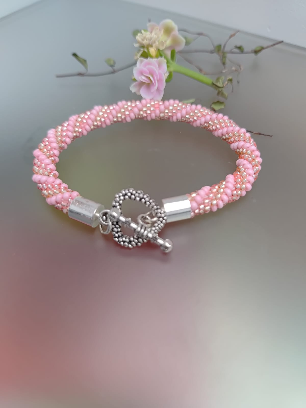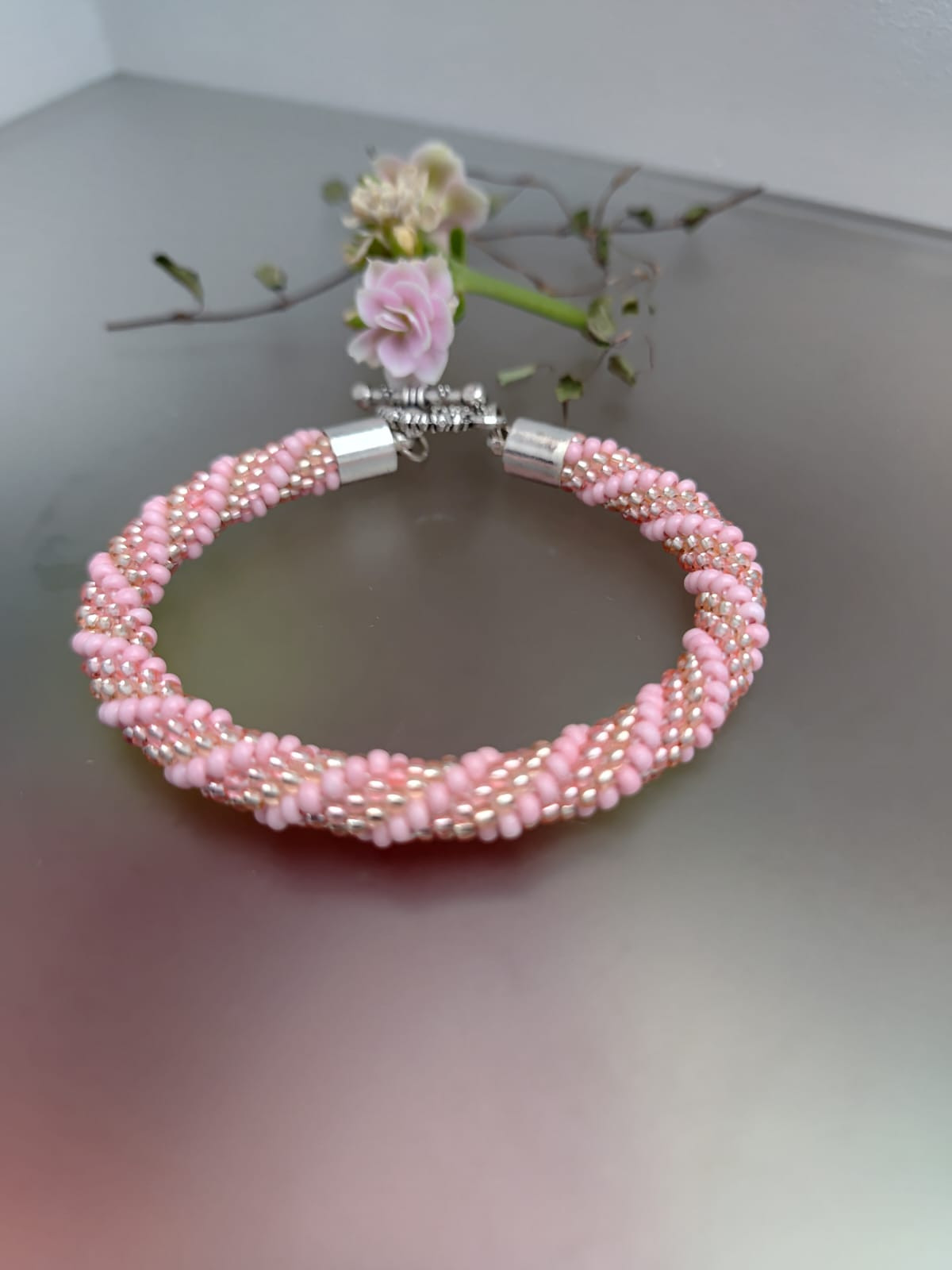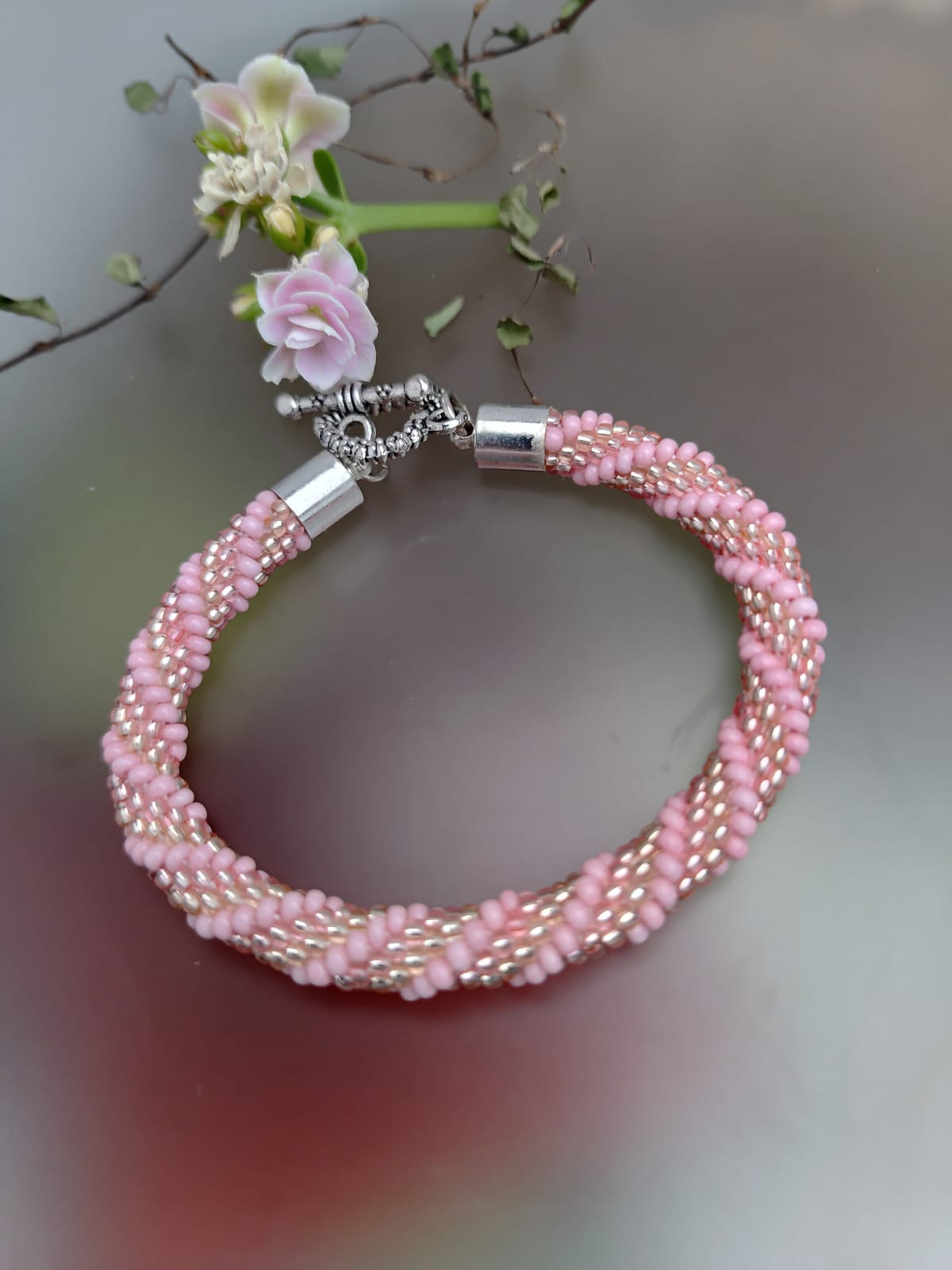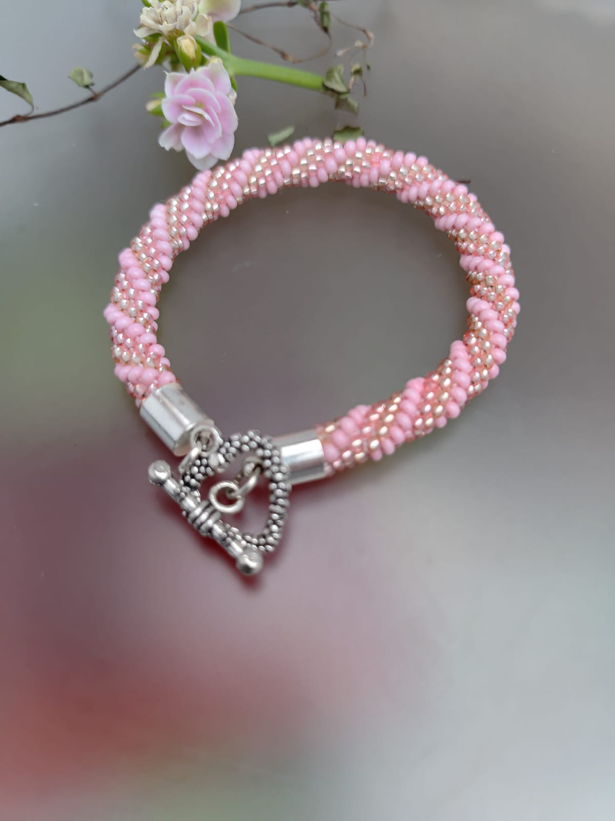 Bransoletka sznur z koralików różnych różowych. Bardzo delikatna. Jasny subtelny kolor. Zapięcie z serduszka. Obwód bez regulacji na nadgarstek do 19 cm, szkło, metal,Bransoletka sznur z koralików różnych różowych. Bardzo delikatna. Jasny subtelny kolor. Zapięcie z serduszka. Obwód bez regulacji na nadgarstek do 19 cm, szkło, metal,