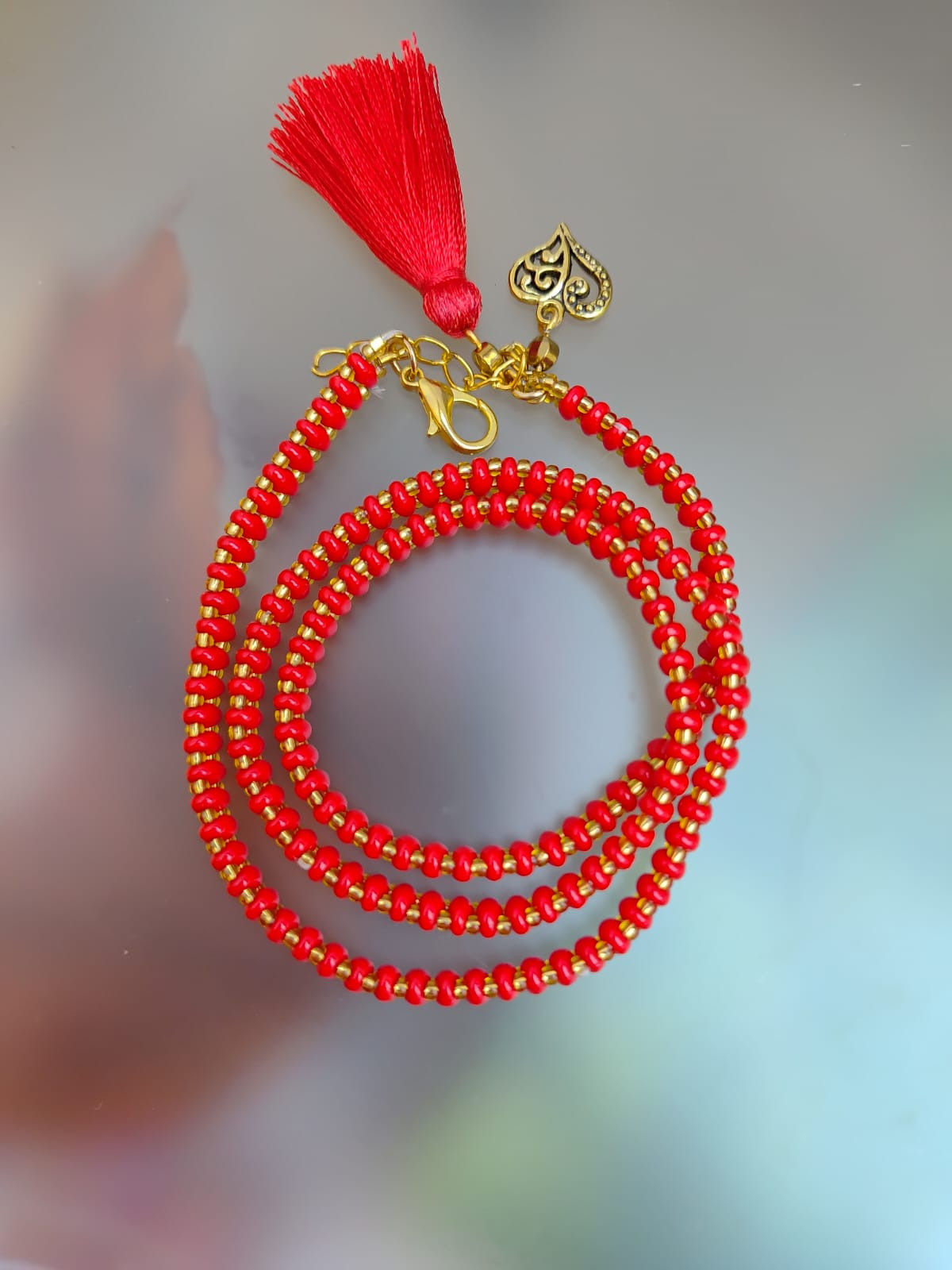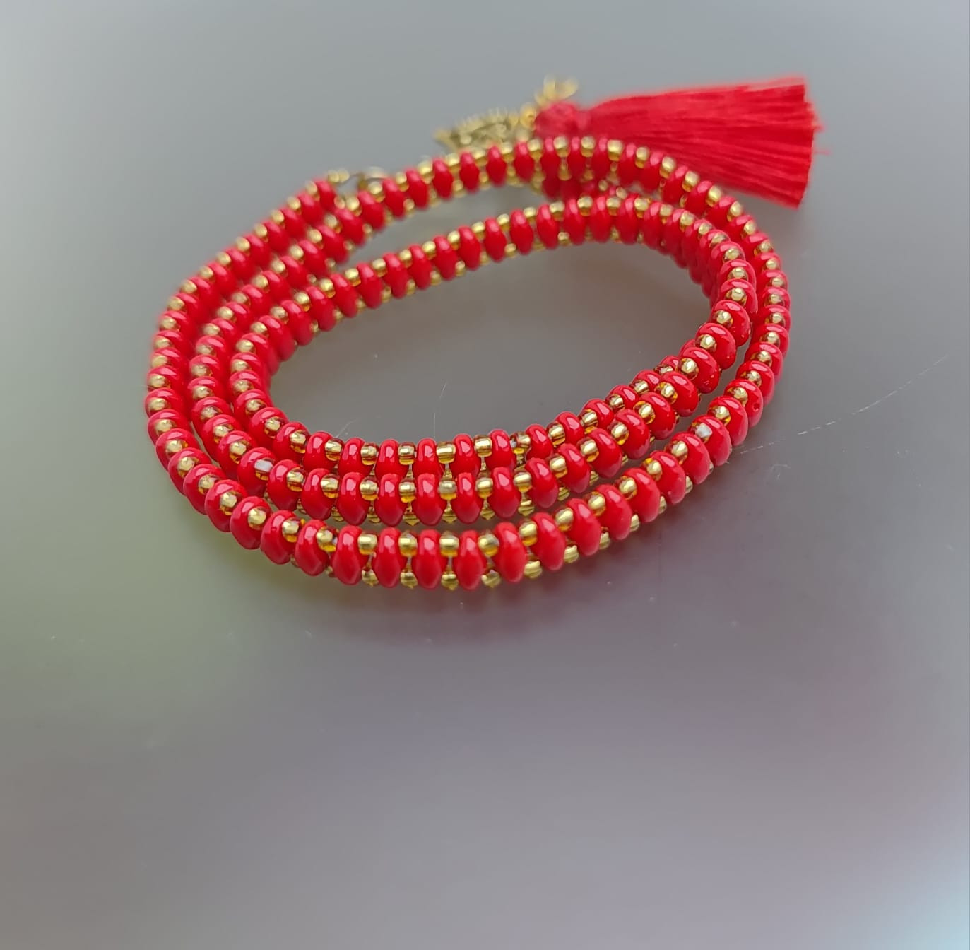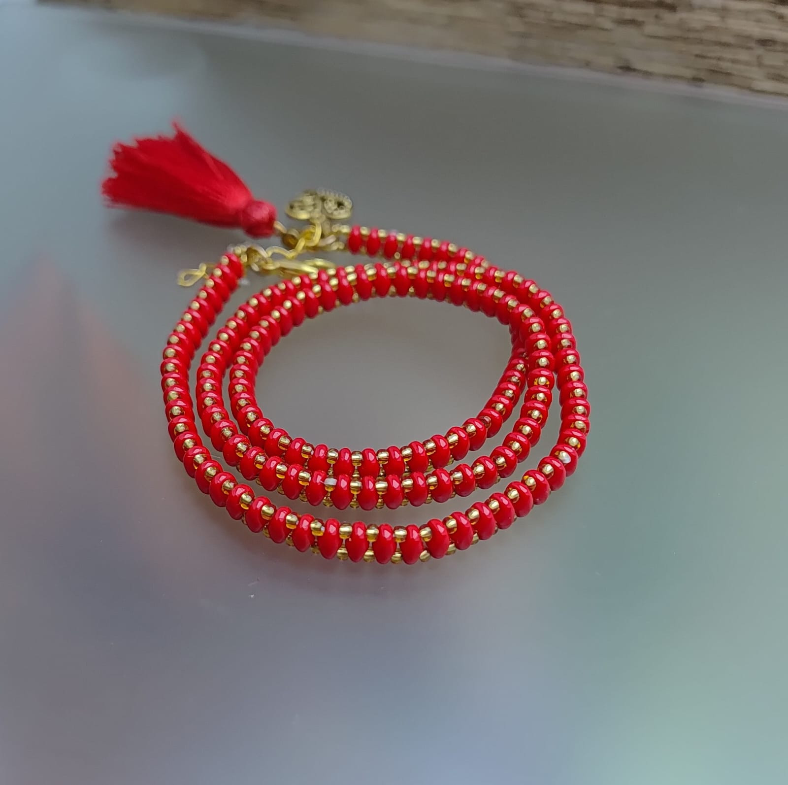 Bransoletka z mocno czerwonych koralików szklanych. Bardzo długa zmijka z koralików, którą można trzykrotnie owinąć wokół nadgarstka. Szkło, metal,