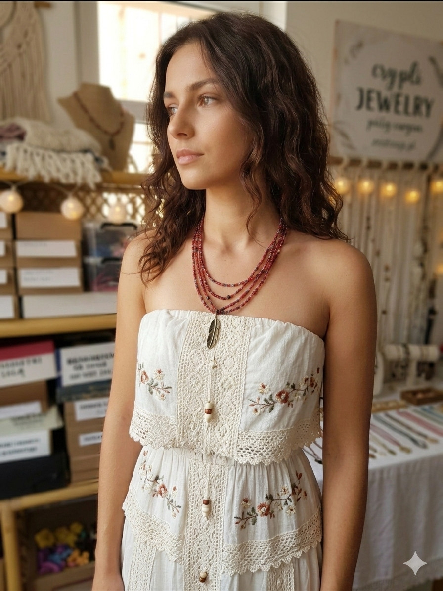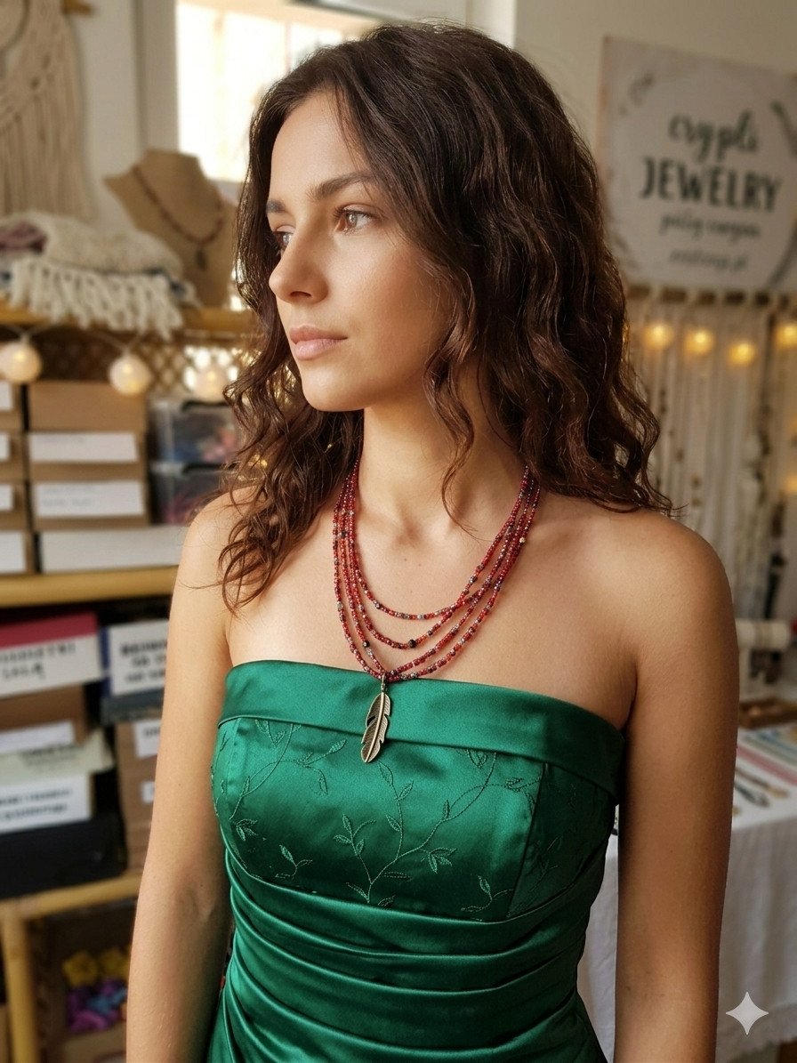 Ten efektowny naszyjnik kaskadowy to idealne połączenie energii koloru czerwonego z subtelnymi akcentami natury. Składa się z kilku rzędów drobnych szklanych koralików w odcieniach intensywnej czerwieni, bordo i delikatnych akcentów błękitu, które wspólnie tworzą bogatą, teksturalną kompozycję. Centralnym punktem naszyjnika jest stylowa zawieszka w kształcie piórka w kolorze antycznego brązu, która nadaje całości etnicznego charakteru. Pomiędzy koralikami wplecione zostały drobne metalowe elementy oraz koraliki o różnych wykończeniach, co sprawia, że biżuteria mieni się przy każdym ruchu. Idealny do stylizacji typu Boho Chic, Gypsy oraz na letnie festiwale. Świetnie komponuje się zarówno z białą, zwiewną sukienką, jak i z denimową kurtką. Naszyjnik ma zapięcie z makramy regulowane. Szkło, hematyt, metalowa zawieszka, sznurek syntetyczny.