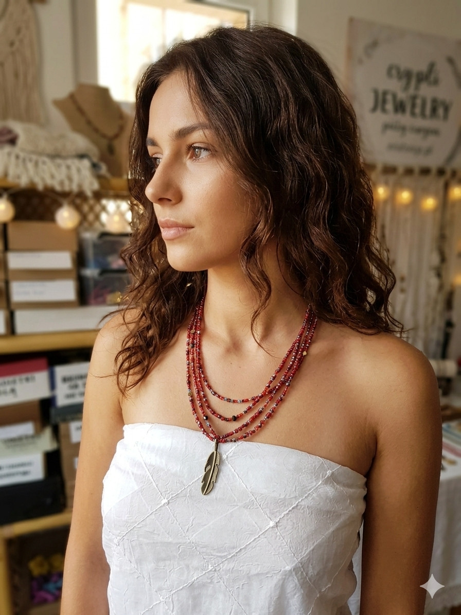 Długi Naszyjnik Boho - Wielowarstwowe Czerwone Korale z Zawieszką Piórkiem