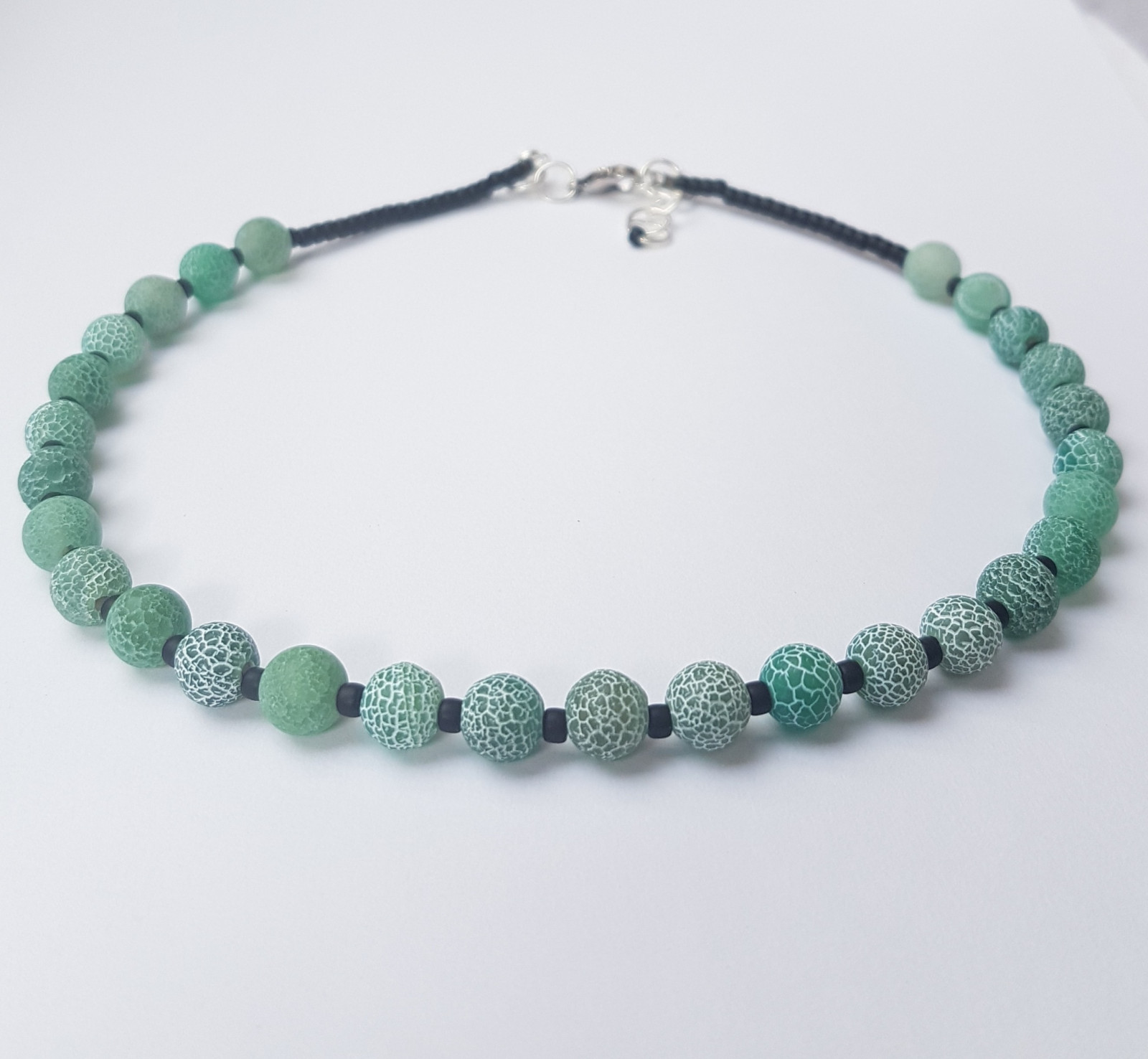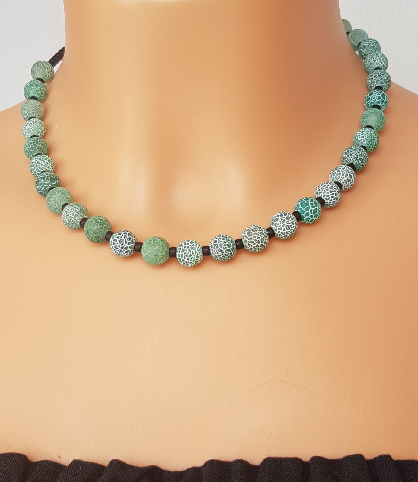 Naszyjnik z kul 8 mm agatu trawionego i małych, matowych koralików szklanych w kolorze czarnym. Naszyjnik jest krótki. Objętość wynosi 39 cm plus 2 cm łańcuszka, zapięcie stal w kolorze srebrnym.