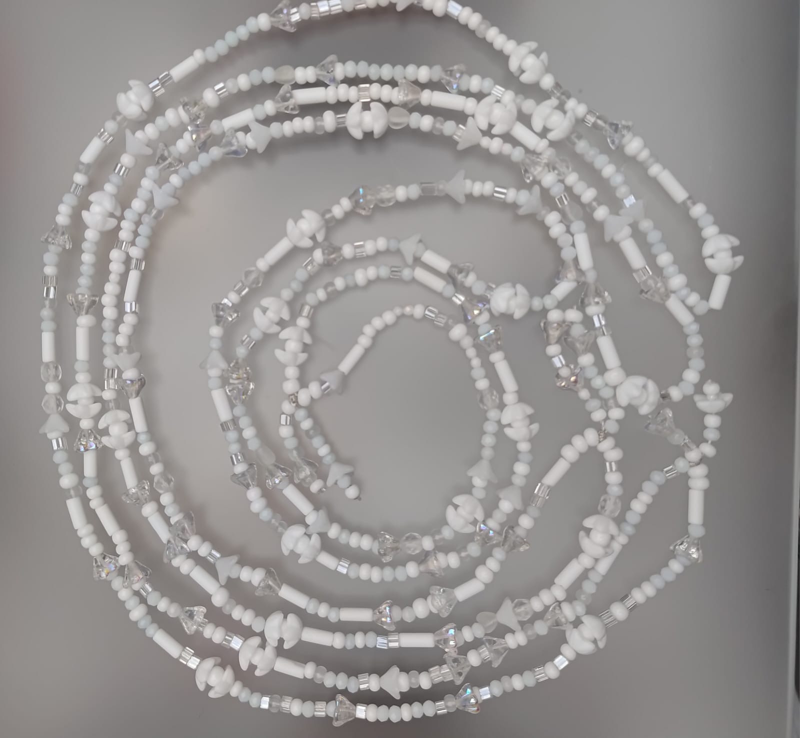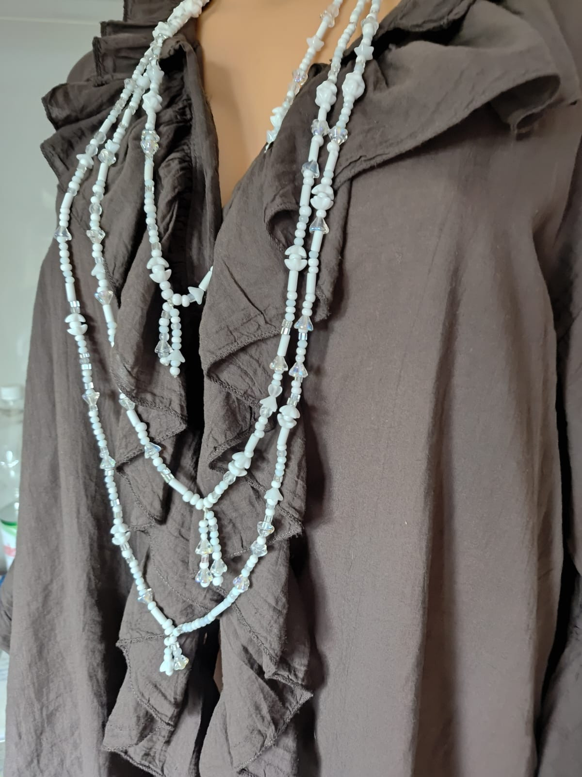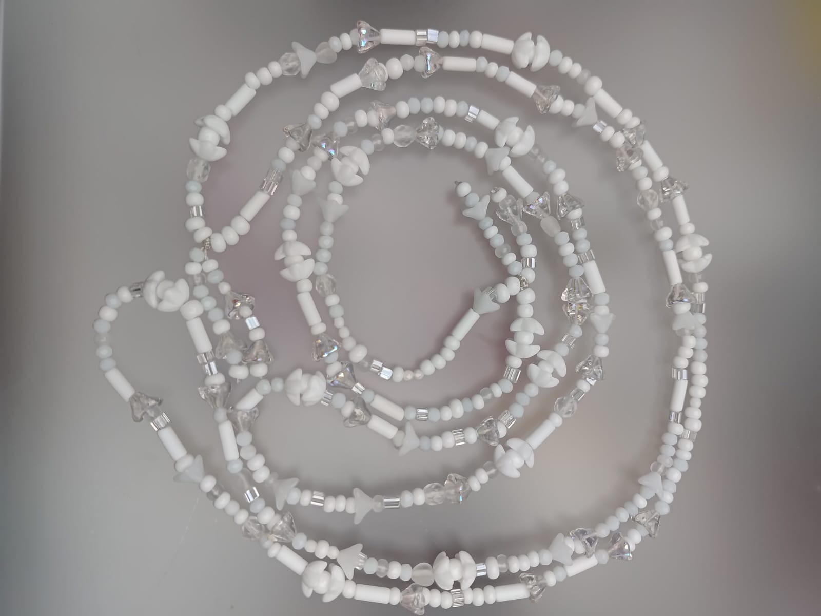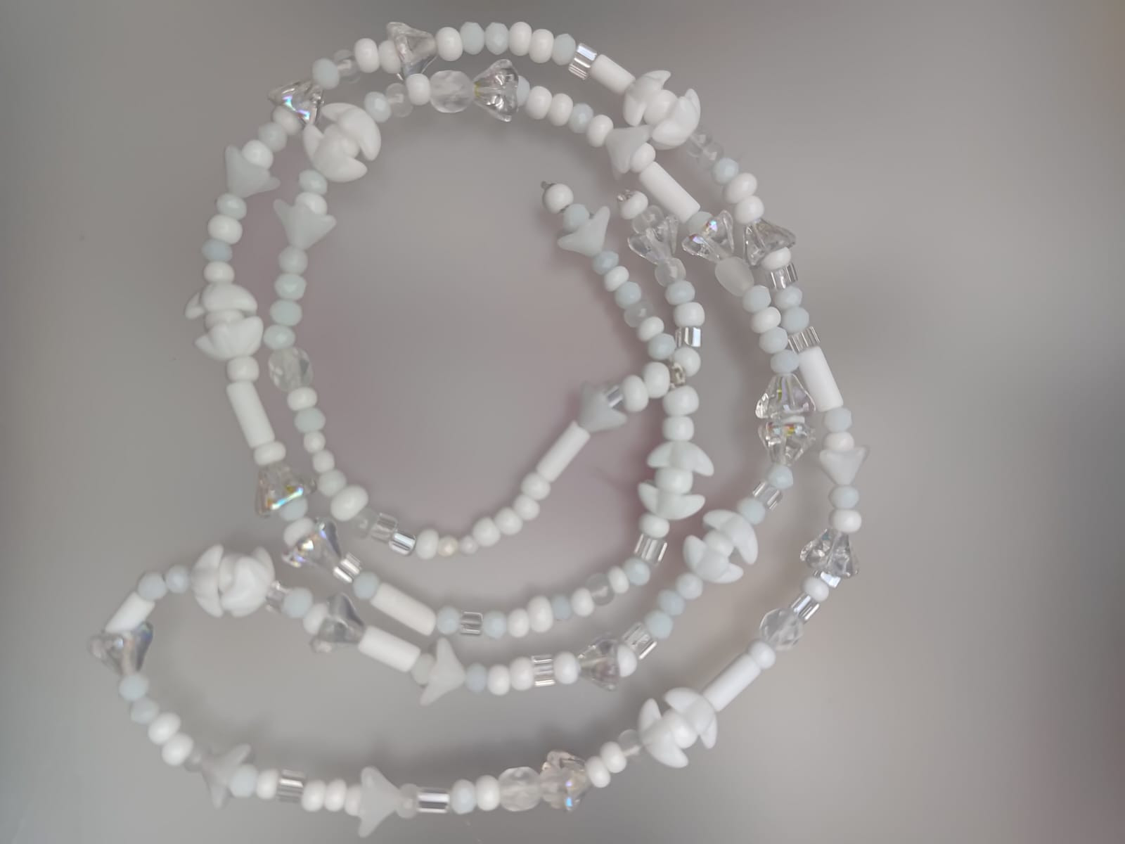 Naszyjnik trzy sznury dużych korali. Białe szklane koraliki drobne i inne duże w kształcie kwiatów. Naszyjnik kaskadowy, każdy sznur korali ma inną długość. Najdłuższy sznur mierzy 57 cm z chwostem malutkim łącznie, średni sznur 50 cm i najmniejszy 39 cm. Bez zapięcia, wygodnie przekładane przez głowę co ułatwia zakładanie zwłaszcza osobie starszej. Dwa zwisające sznureczki mogą być założone do tyłu co powoduje, że naszyjnik zmienia wygląd na bardziej klasyczny sznur korali. Bez metalu.