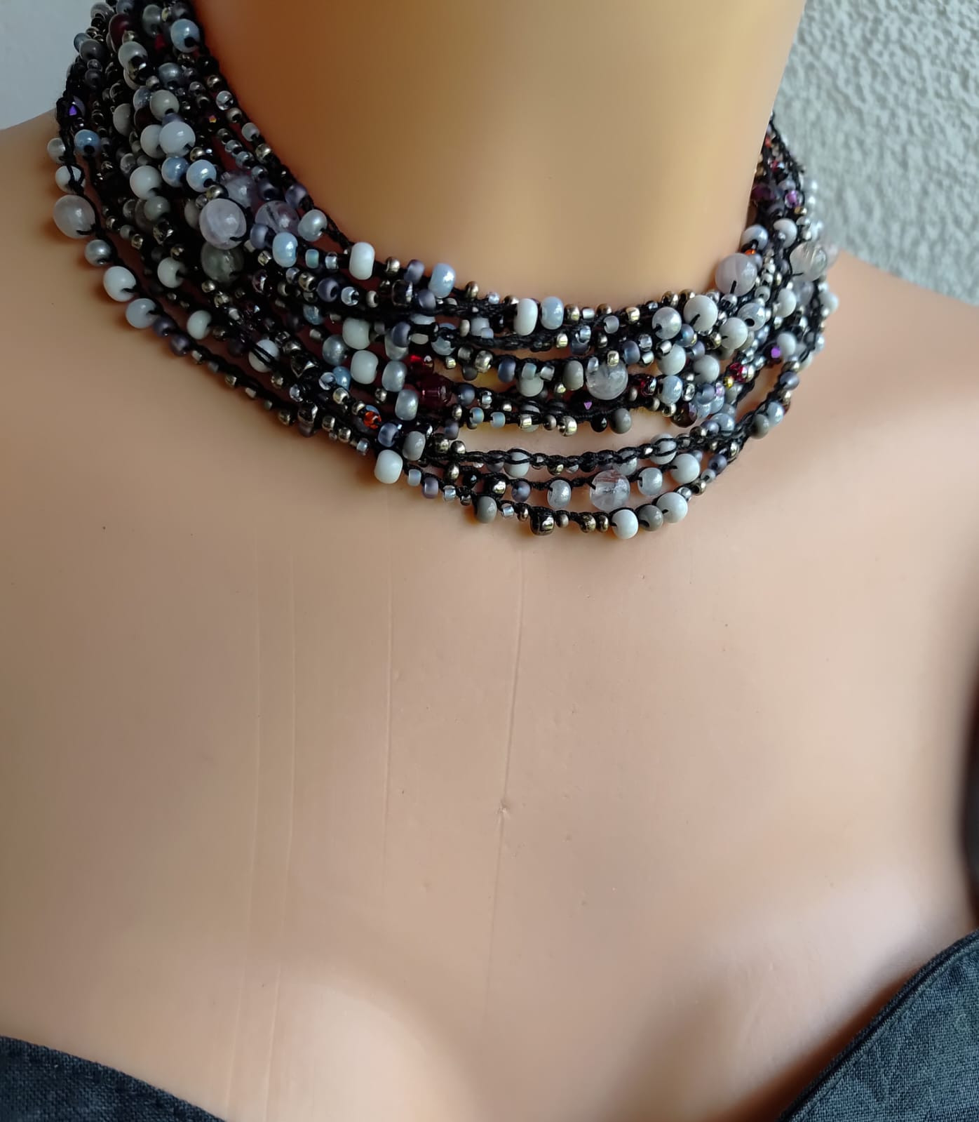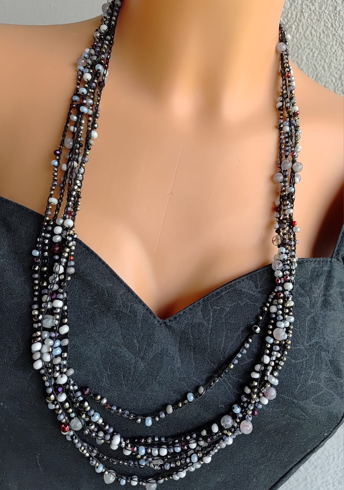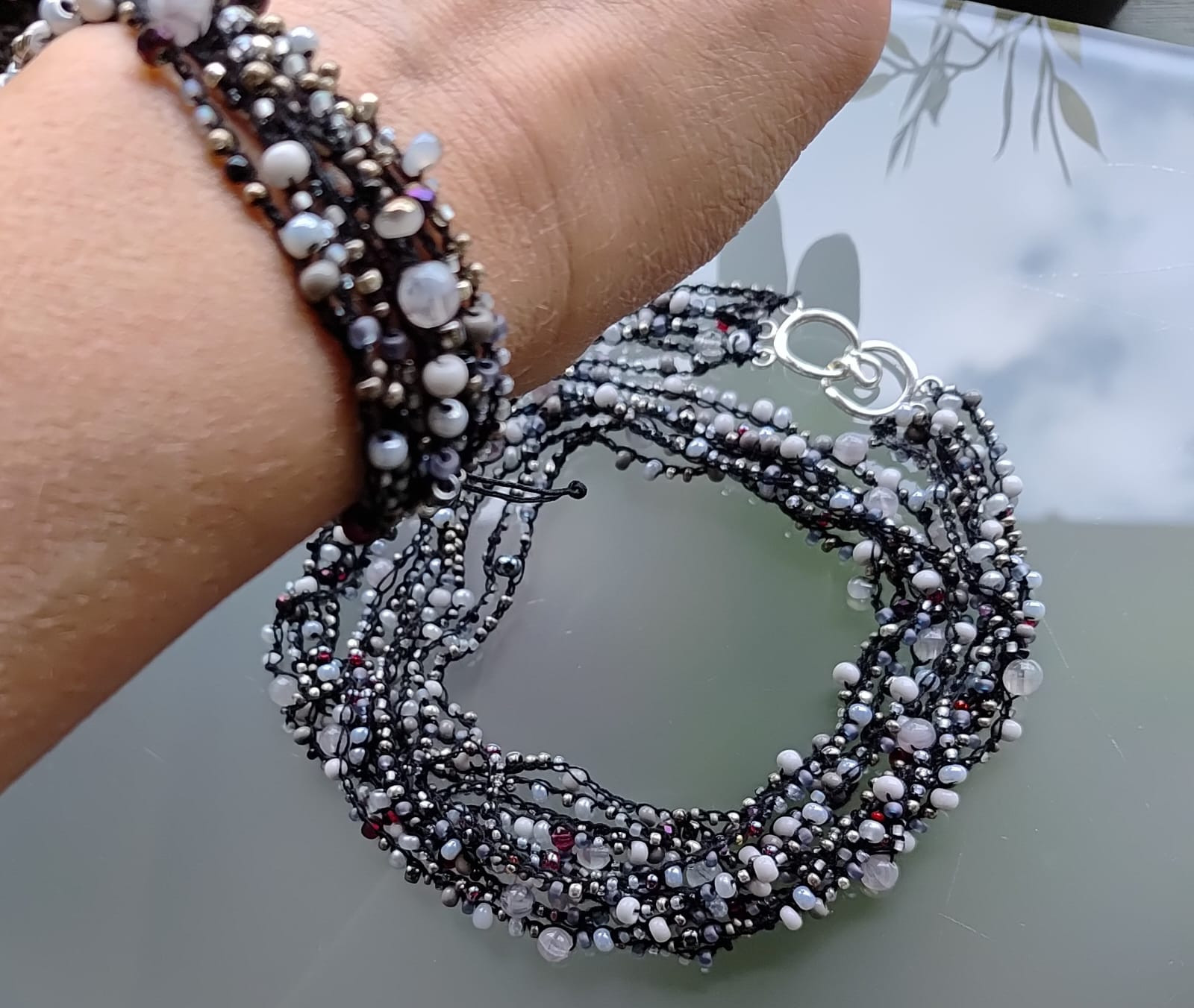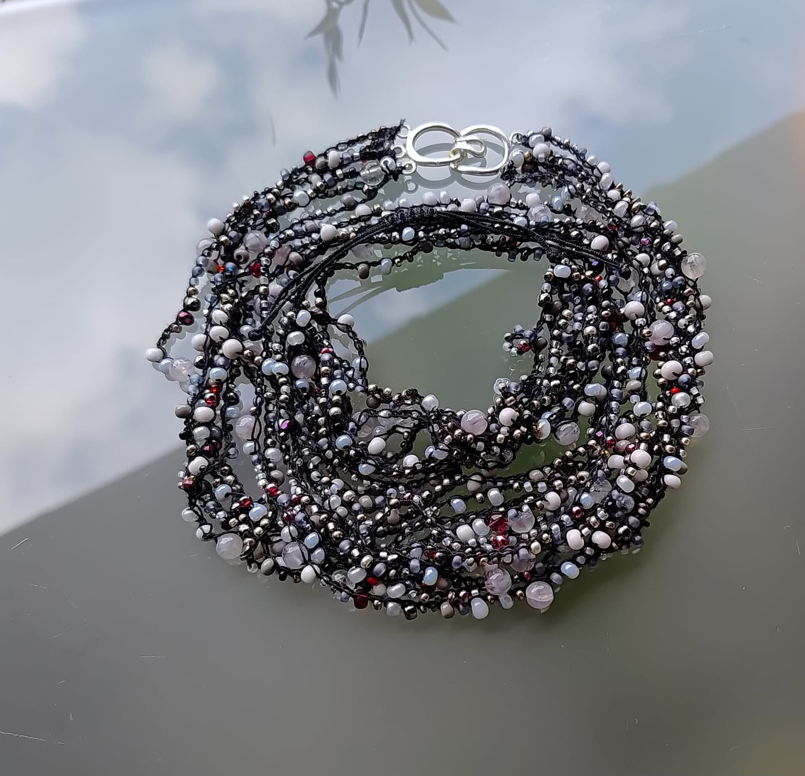Naszyjnik i bransoletka z różnych koralików w przeważającej ilości szarych i niewielkiej ilości czerwonych. Długość 36 cm, bransoletka z zapięciem makramowym pasuje na każdy nadgarstek, zapięcie metal, szkło