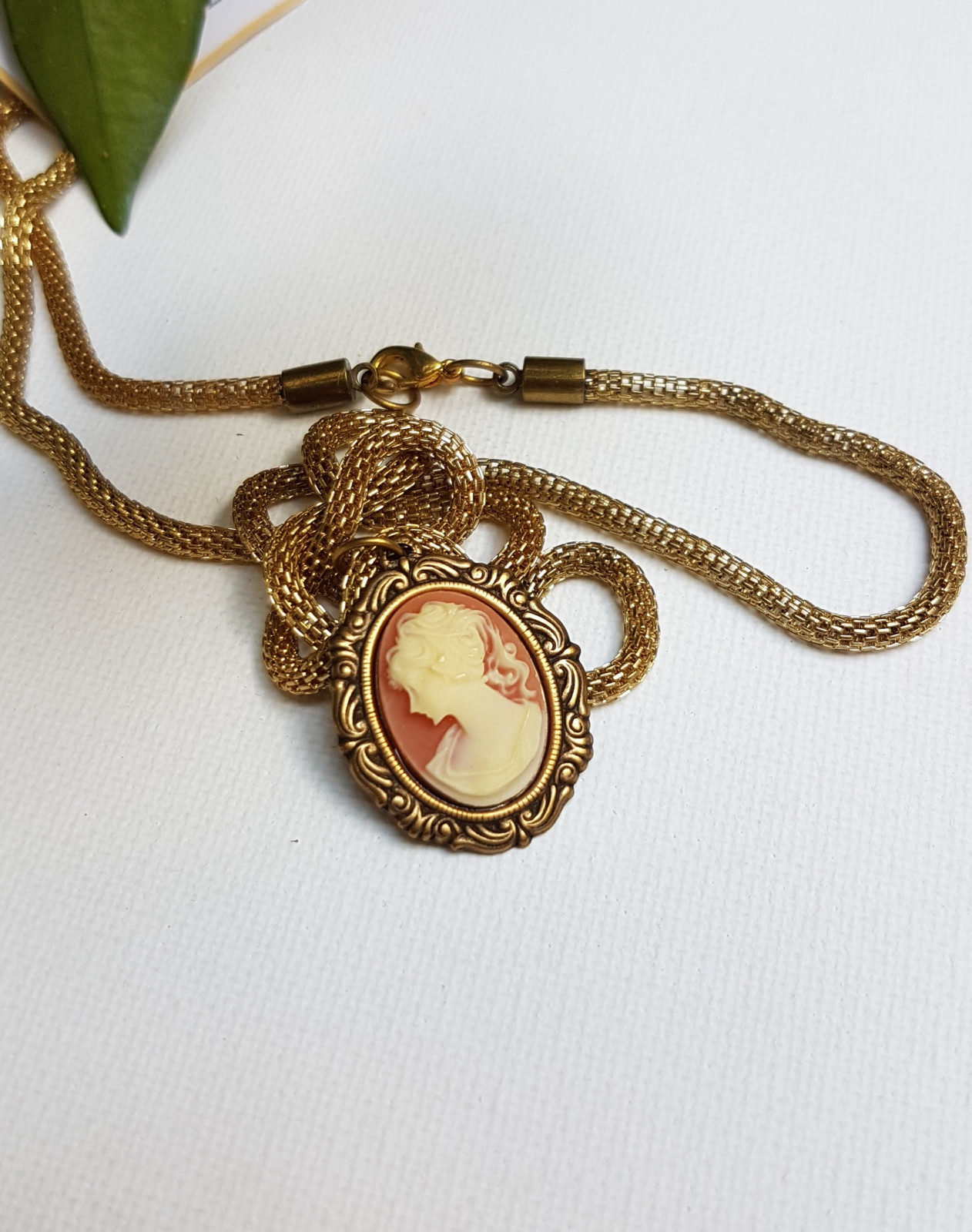 Naszyjnik w stylu retro. Camea z wizerunkiem kobiety w kolorze kości słoniowej na łososiowym tle. Wisiorek w mosiężnej oprawie. Długość naszyjnika z wisiorkiem 46 cm