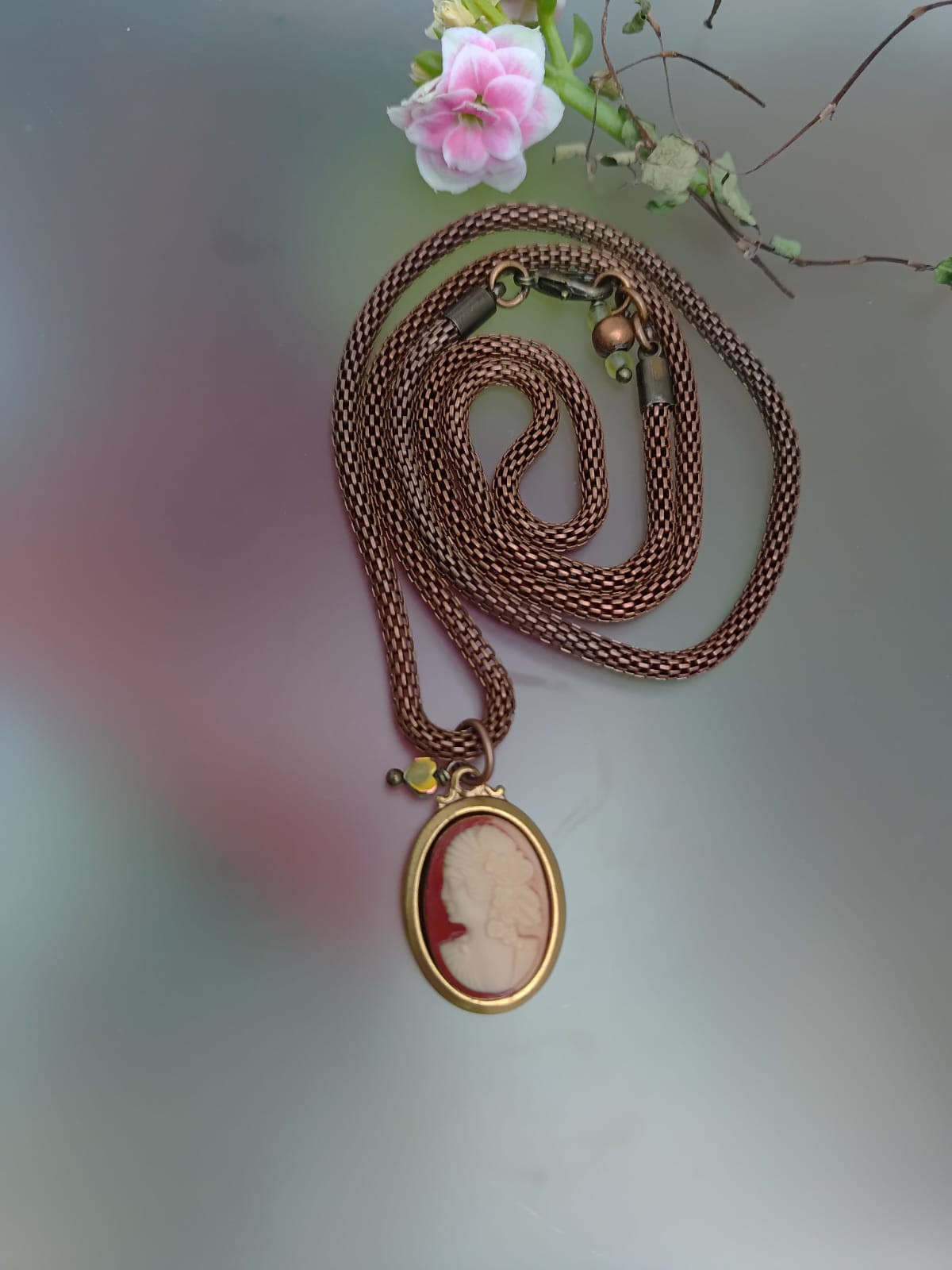 Naszyjnik na łańcuszku metalowym okrągłym w kolorze miedzi. Camea wisiorek w mosiężnej oprawie w kolorze złotym. Camea piękna z czeskiego szkła, na rudo brązowym tle wizerunek damy w kolorze kości słoniowej. Wisiorek ozdobiony maleńkim serduszkiem z hematytu. Bardzo delikatny naszyjnik, lekki. Długość naszyjnika 30 cm plus wisiorek 2,7 cm