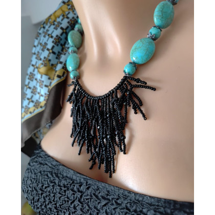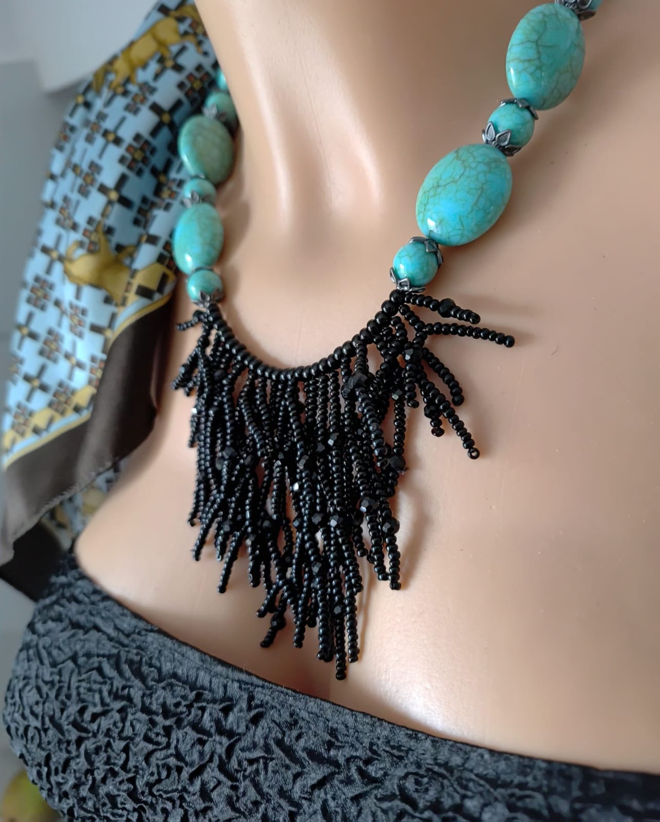 Naszyjnik krótki z koralików w kształcie oliwek w kolorze turkusowym. Ręcznie wyplecione frędzle z czarnych koralików okrągłych i fasetowanych kryształków szklanych. Przekładki metalowe kwiatuszki. Kuleczki hematytów w kolorze srebrnym. Objętość naszyjnika wynosi 43-46 cm, Zapięcie i ogniwka ze stali nierdzewnej. Naszyjnik będzie dobrze wyglądał jako elegancki dodatek do wieczorowej kreacji, ale równie dobrze prezentuje się do letniej sukienki.