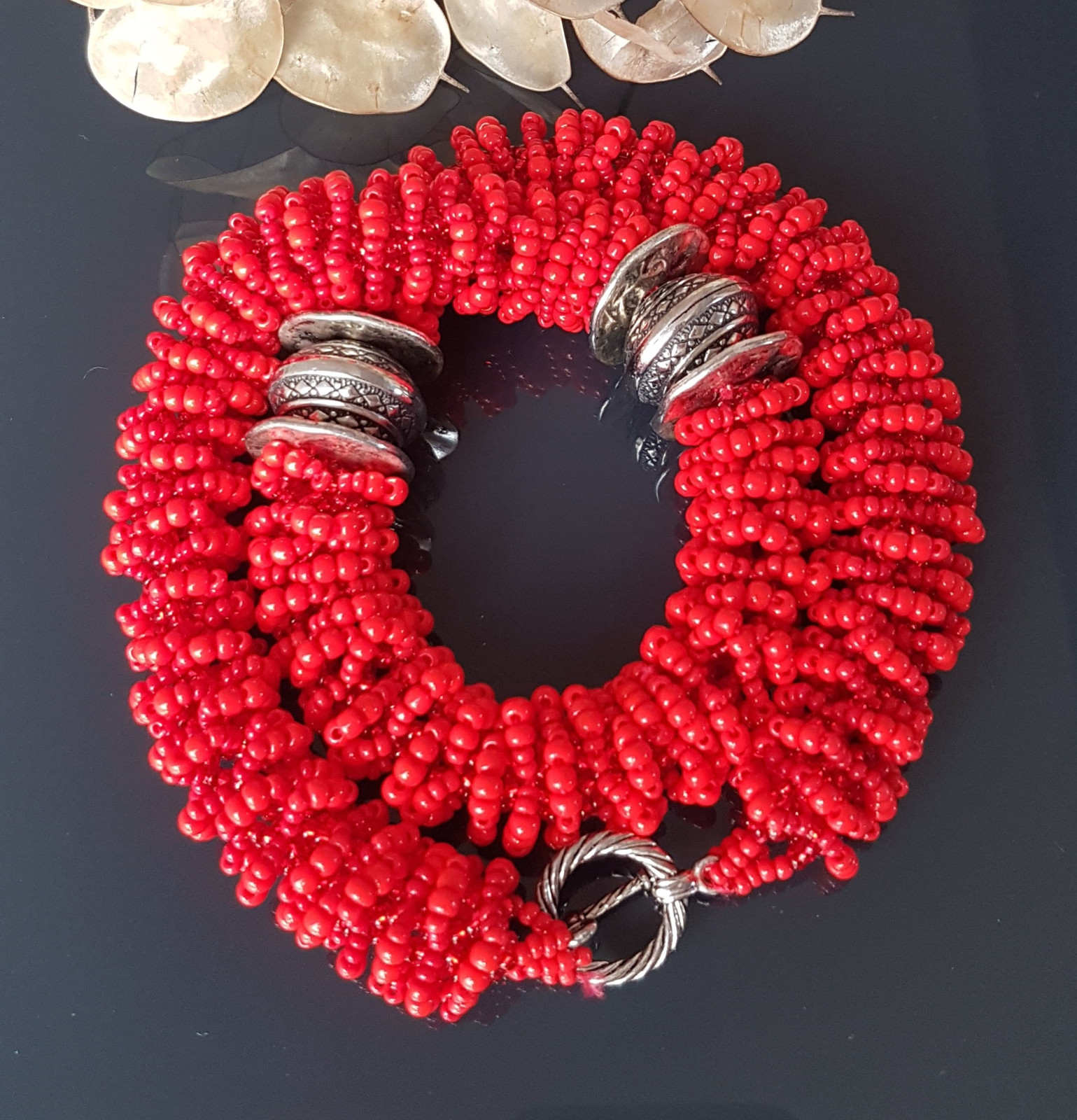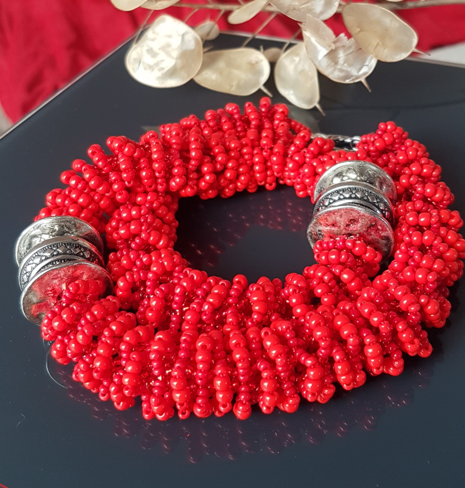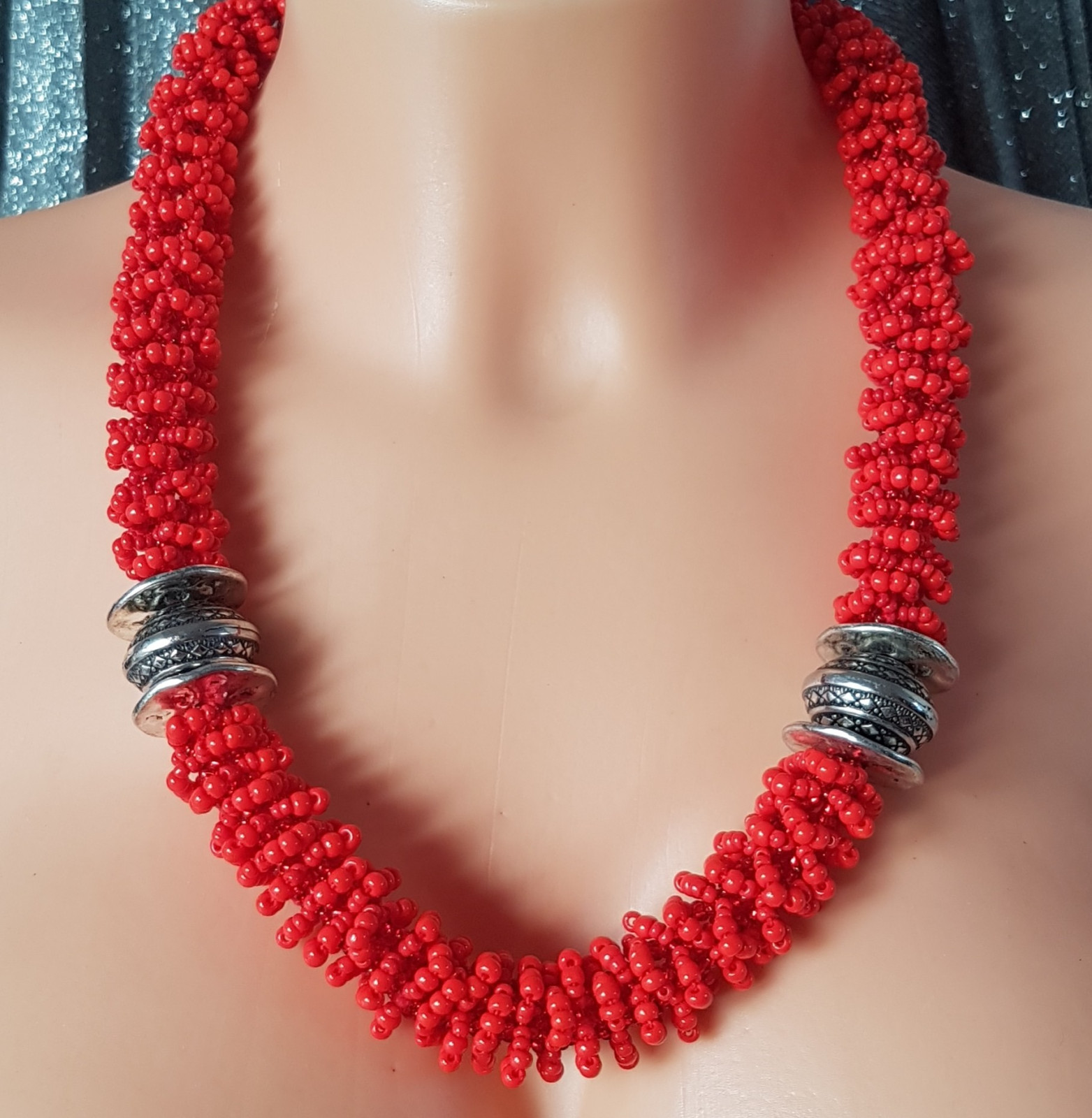 Naszyjnik w intensywnym czerwonym kolorze, wypleciony z małych koralików, przekładki bali metalowe, doskonały do podkreślenia stylu boho, pasuje do wielu kreacji, objętość 60 cm bez regulacji, szkło, metal