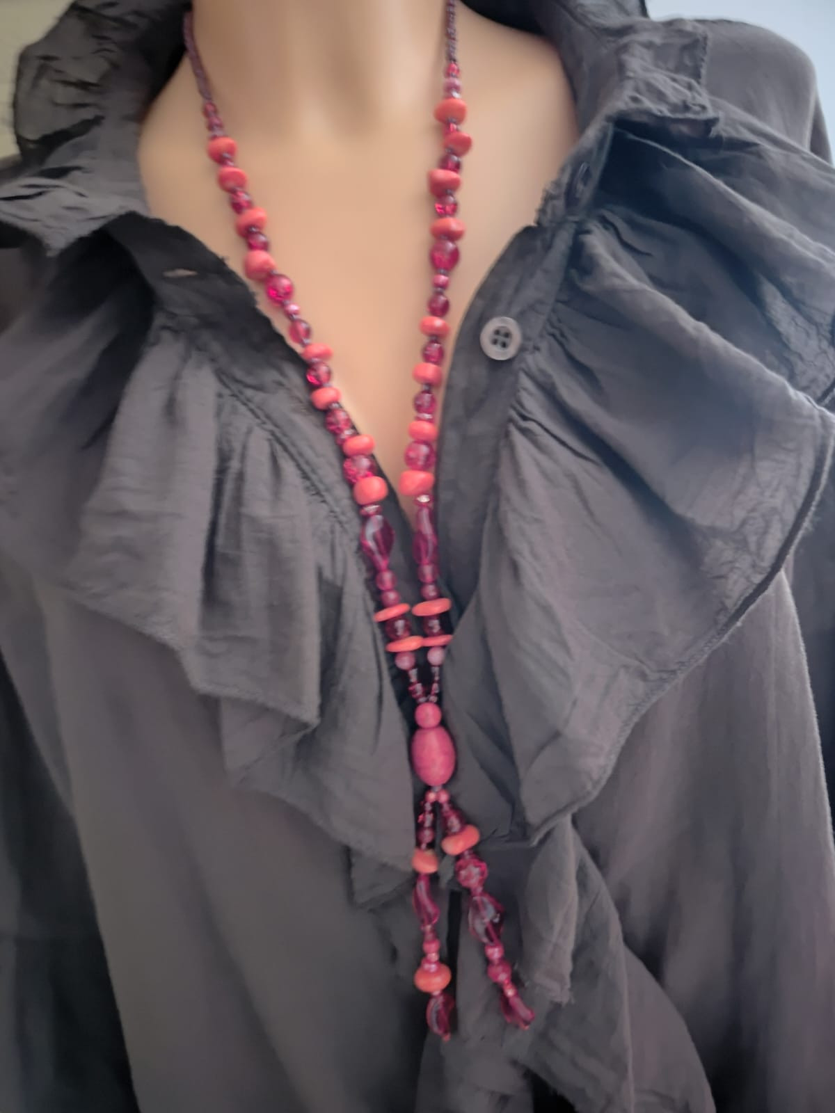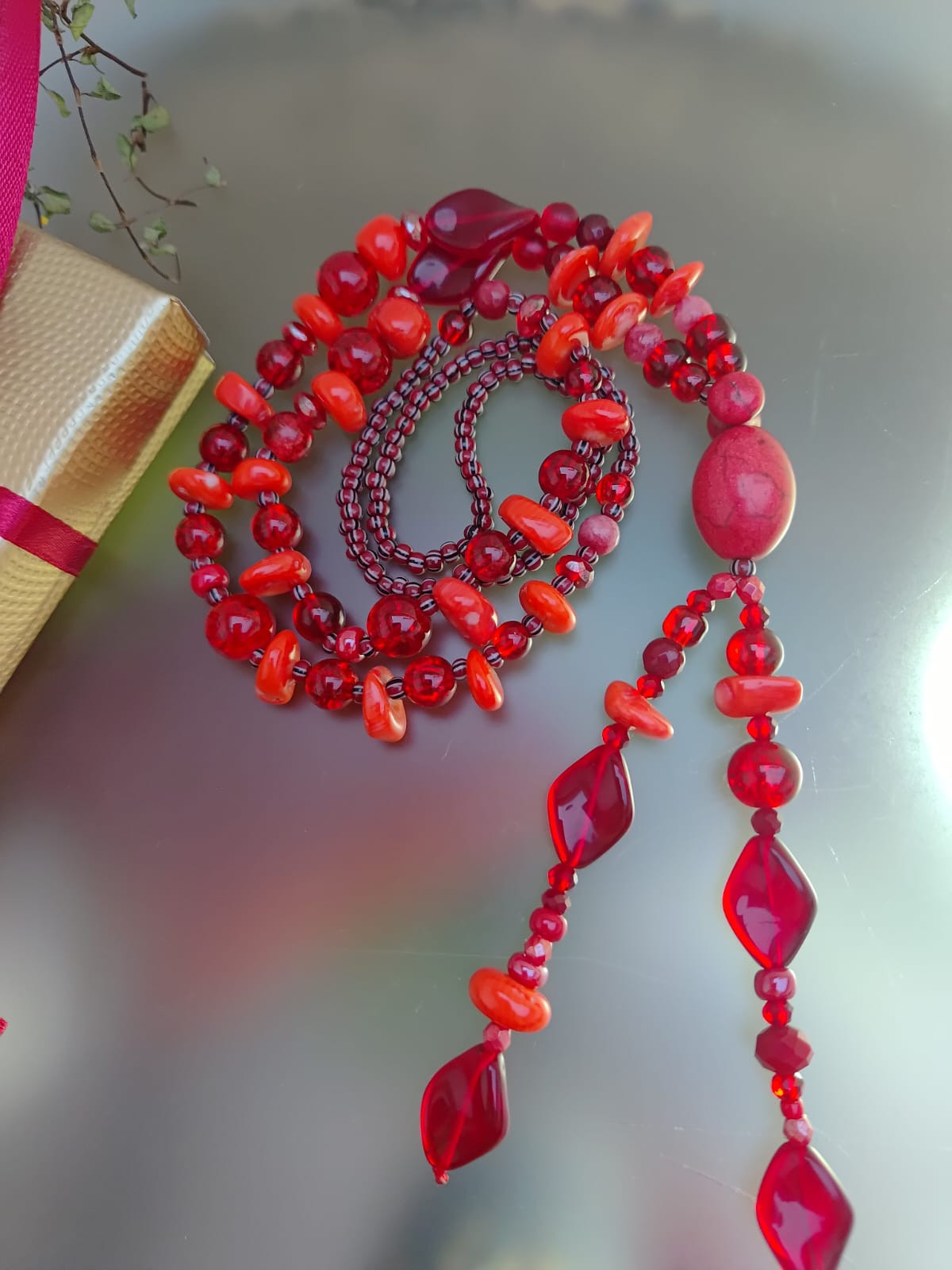 Naszyjnik długi z koralików. Mix koralików szklanych, howlit czerwony i koral czerwony bryłki, hematyt. Delikatny, efektowny naszyjnik. Bez zapięcia, przekładany przez głowę. Na sznurku syntetycznym czerwonym. Długość naszyjnika z frędzlami wynosi 48 cm