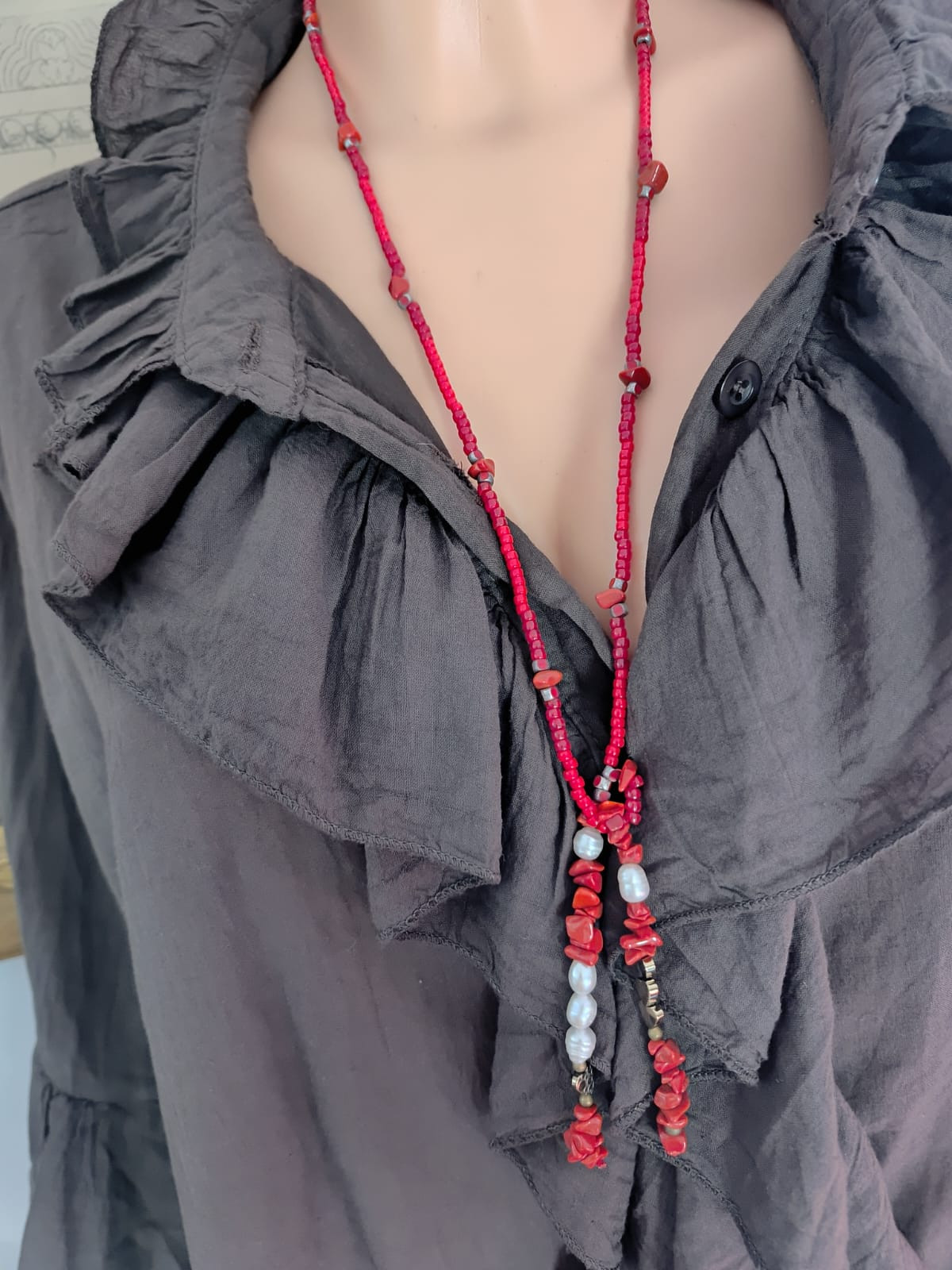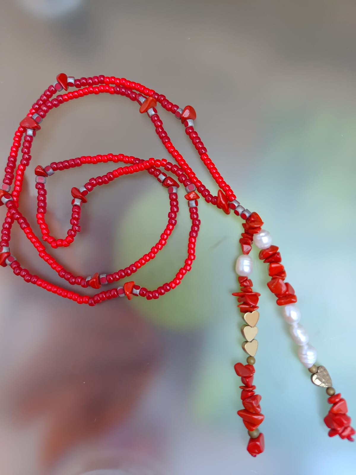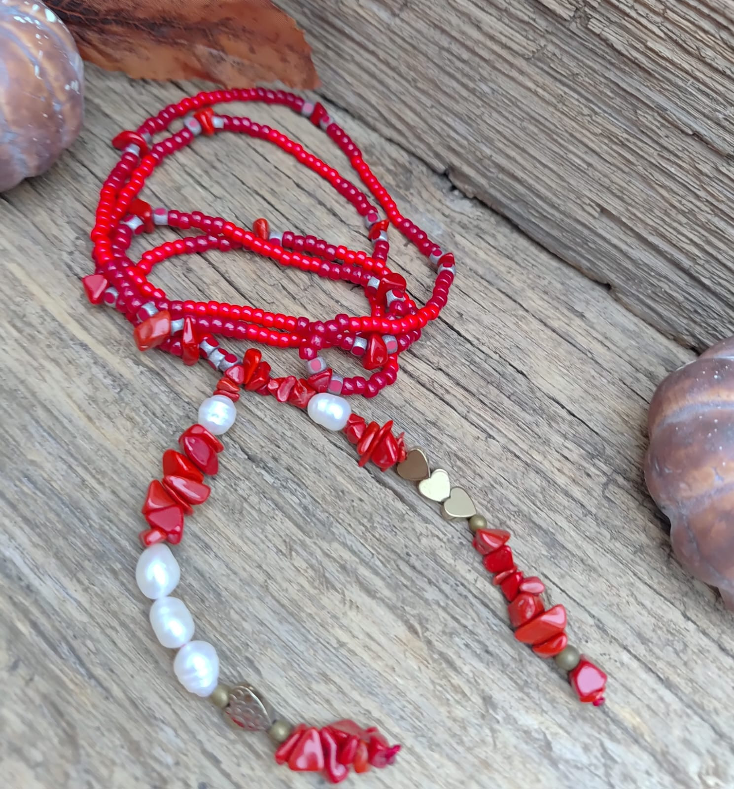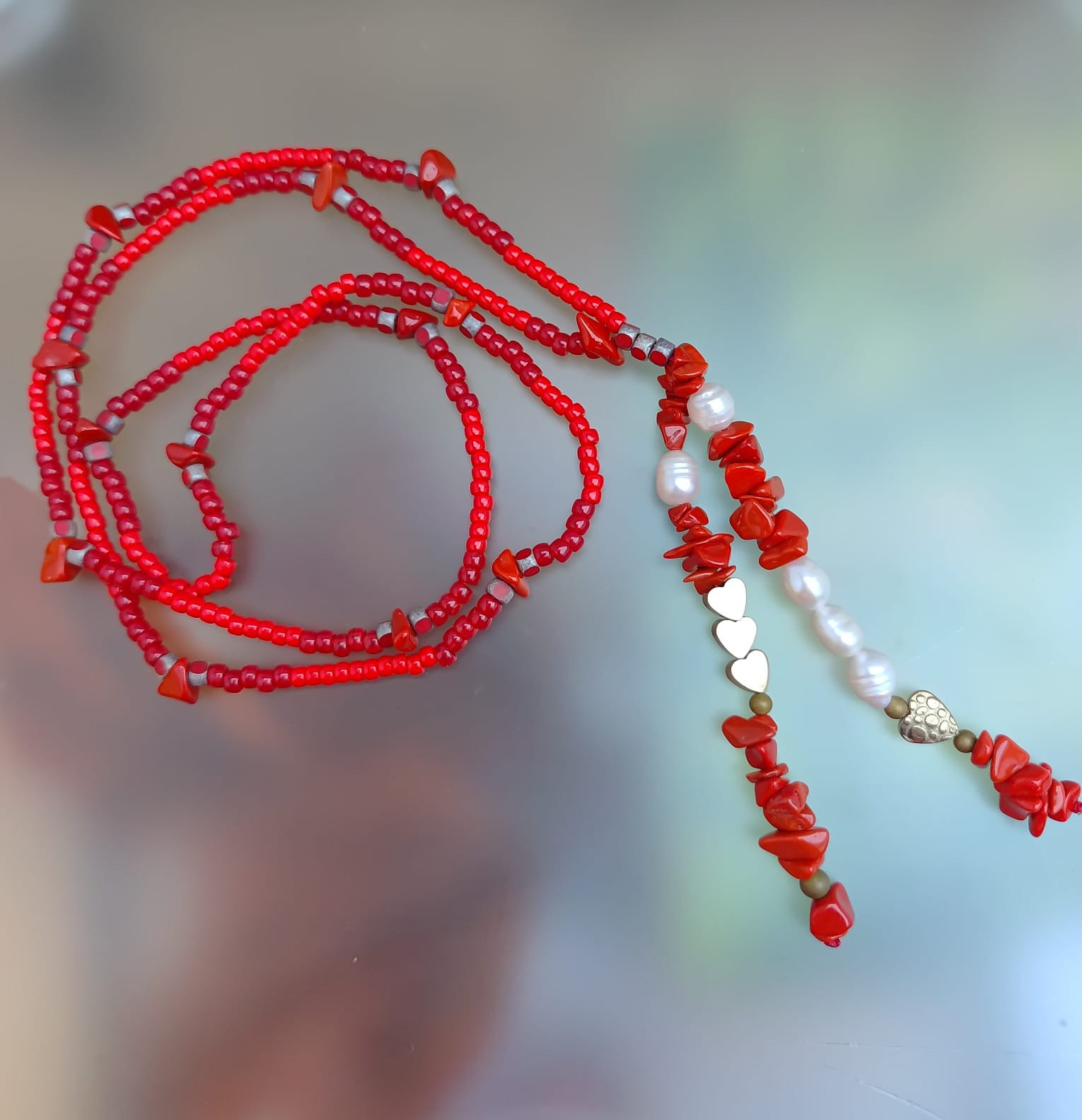 Naszyjnik długi z koralików. Koraliki szklane, czerwone różne i koral czerwony bryłki. W wisiorku występują również perełki hodowlane i serduszka z hematytu. Delikatny, efektowny naszyjnik. Bez zapięcia, przekładany przez głowę. Na sznurku syntetycznym czerwonym. Długość naszyjnika z frędzlami wynosi 44 cm