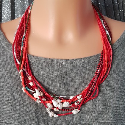 Czerwone korale w intensywnym odcieniu z dodatkiem koralików perłowych eqrue, zielonych, pomarańczowych. W miejscu centralnym perły hodowlane i muszelki malutkie 11 mm, metalowe wykończenia w kolorze złotym, zapięcie karabińczyk.