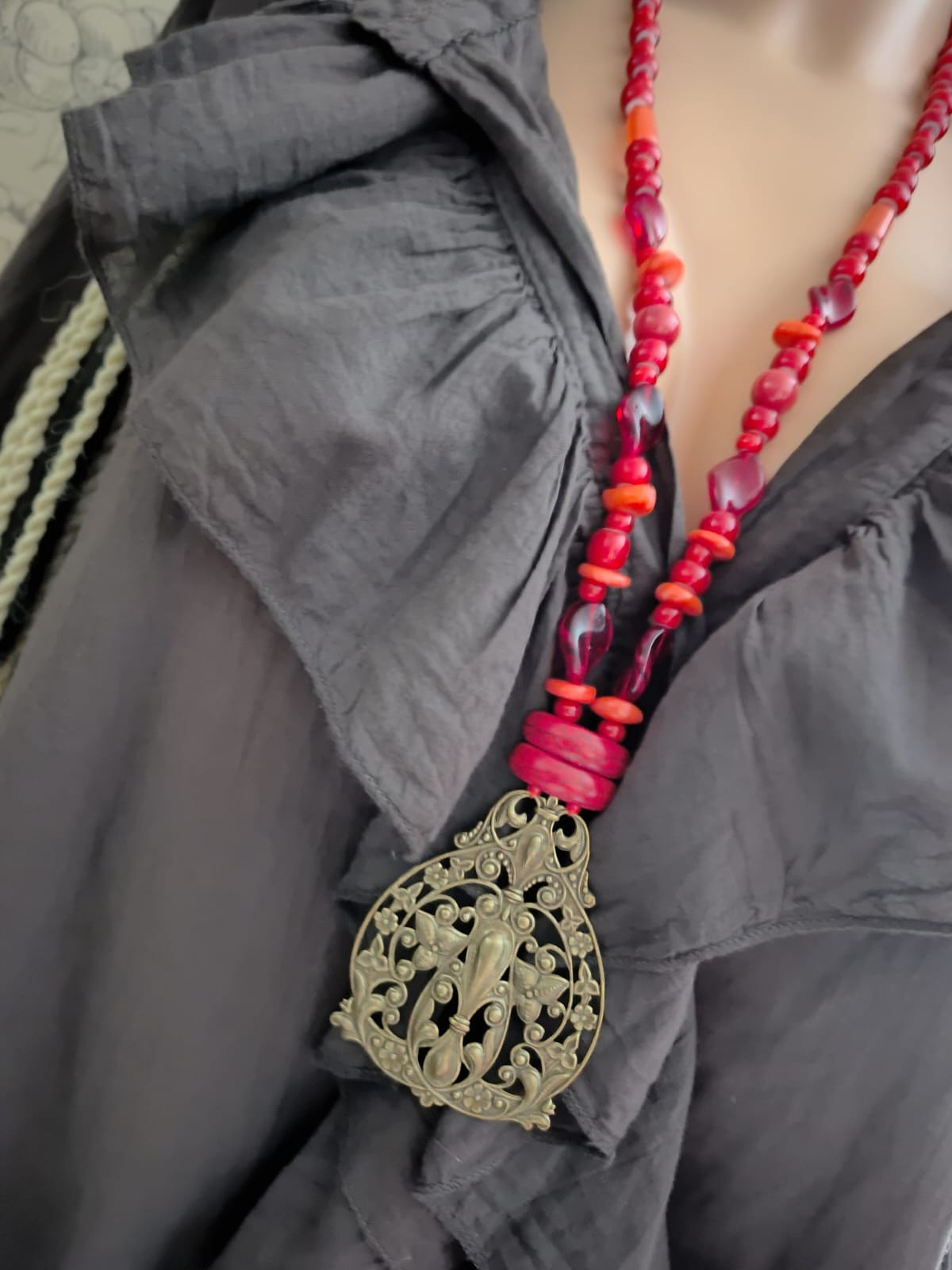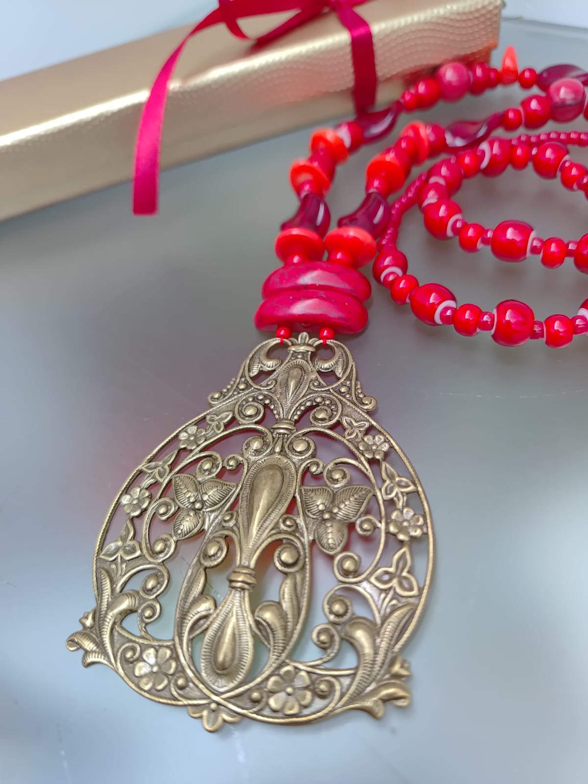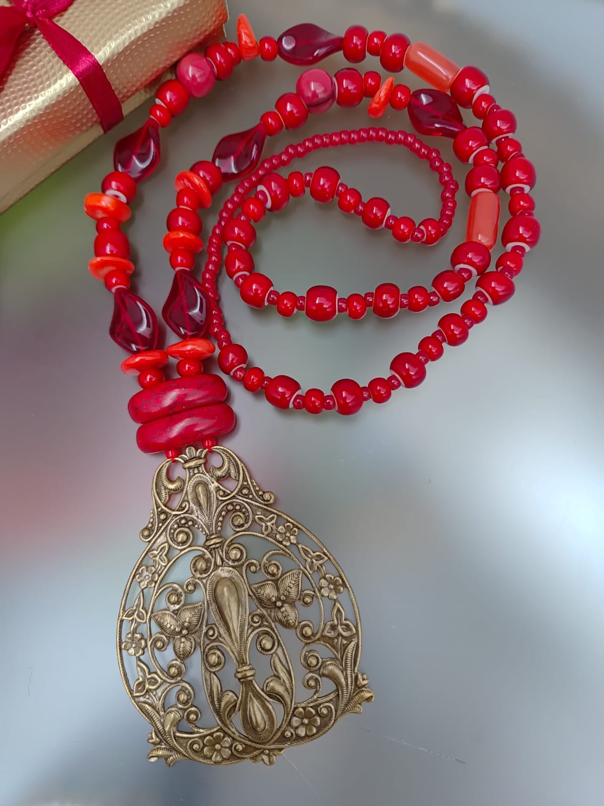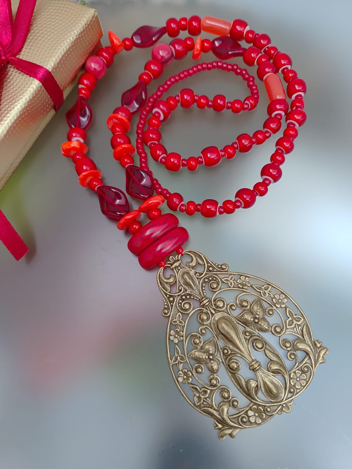 Naszyjnik Czerwony Vintage Z Zawieszka Dużą Wisior Floral 25.160
