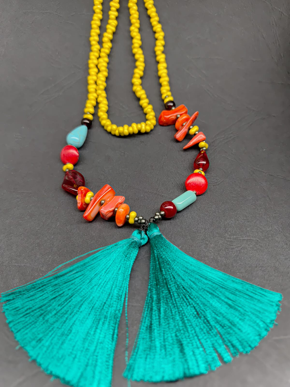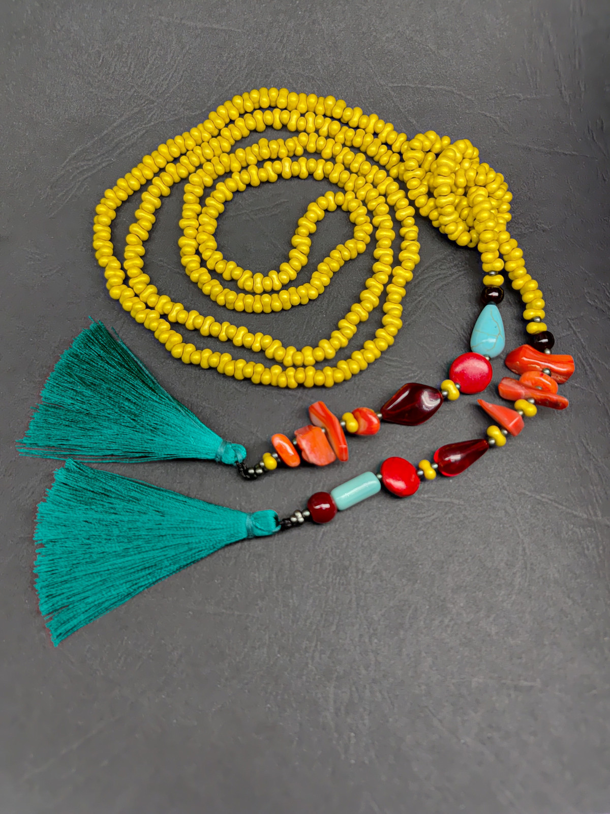 Naszyjnik w lekko szalonej kolorystyce. W śnieżną zimę przywodzi na myśl słońce, rafy koralowe, turkusowe morze, szmaragdową zieleń, przypominając, że gdzieś tam czekają na nas ciepłe plaże. Naszyjnik z korali szklanych, długi w całości z chwostami ma 150 cm. Pięknie prezentuje się na białej lnianej sukience i do każdej innej kreacji będzie doskonały.