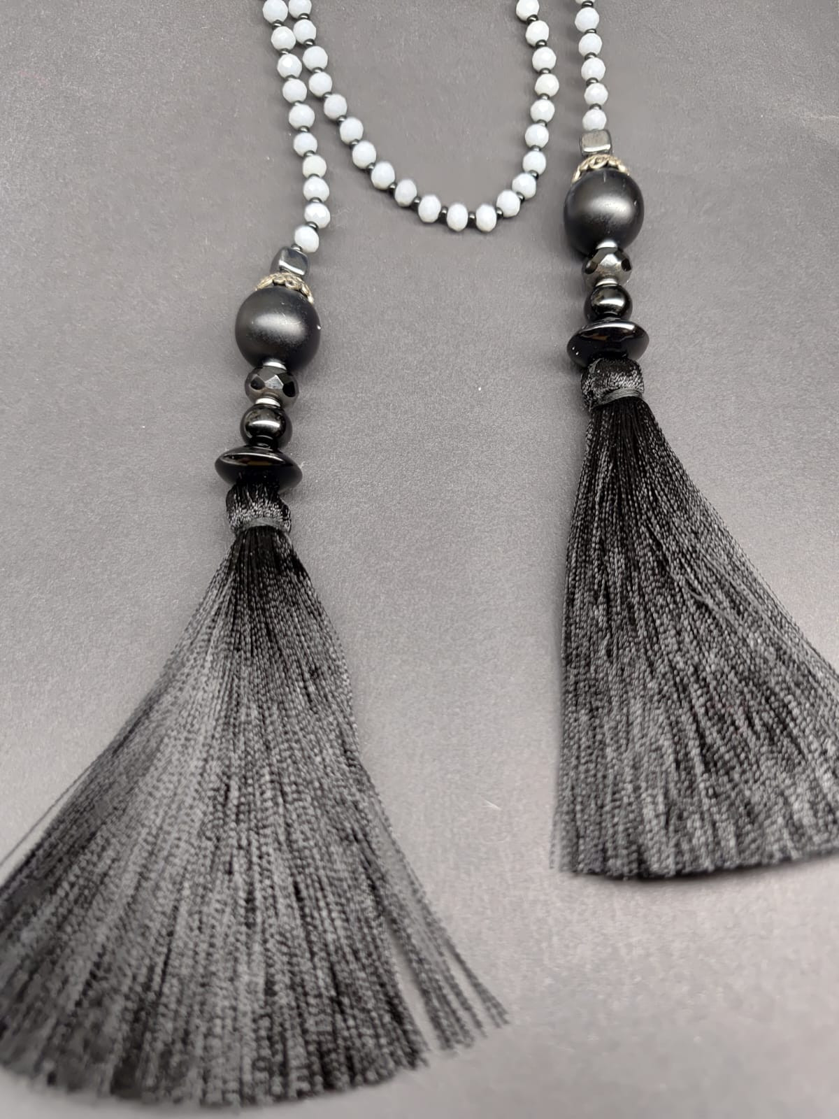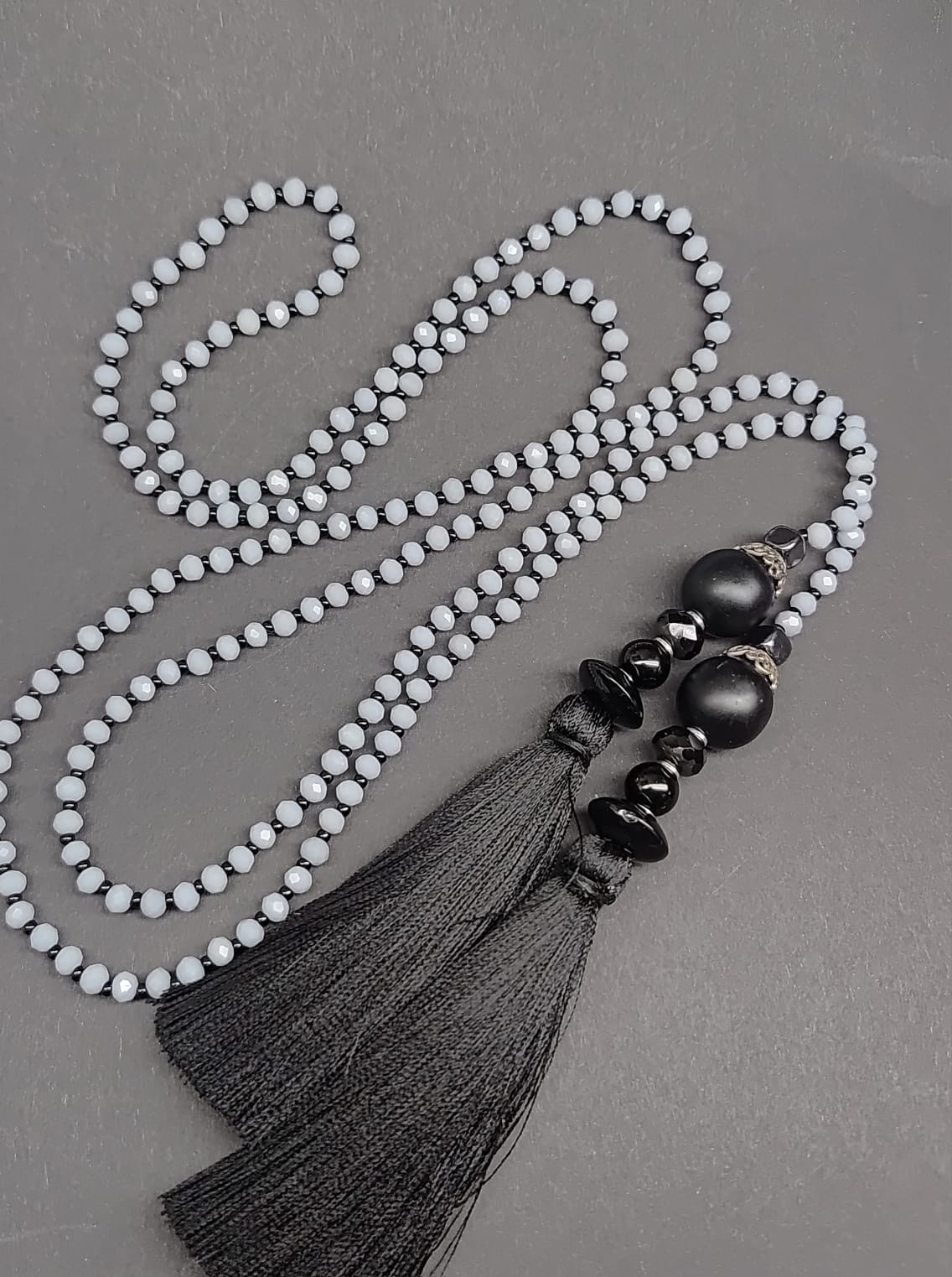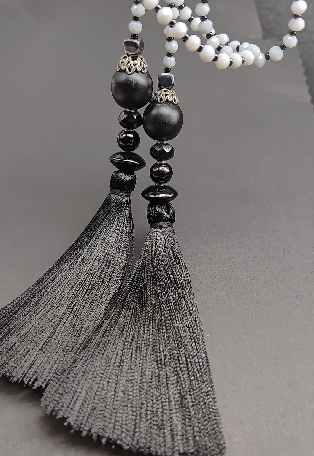 Bardzo ciekawa forma naszyjnika bez zapięcia. Długi sznur korali szklanych oponek fasetowanych w kolorze szarym z czarnymi szklanymi przekładkami. Sznur można nosić luzno zwisający raz owinięty wokół szyi, można dowolnie wiazać, można nosić jako paseczek do sukienki. Do zrobienia go użyłam sznurka syntetycznego, korali szklanych, przekładek hematytu i koszyczków ażurowych posrebrzanych.