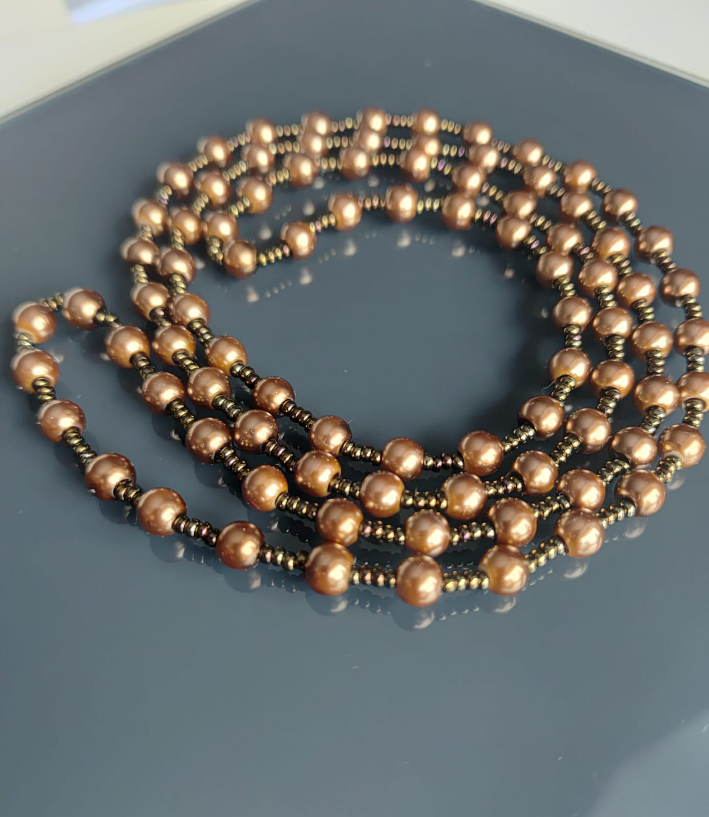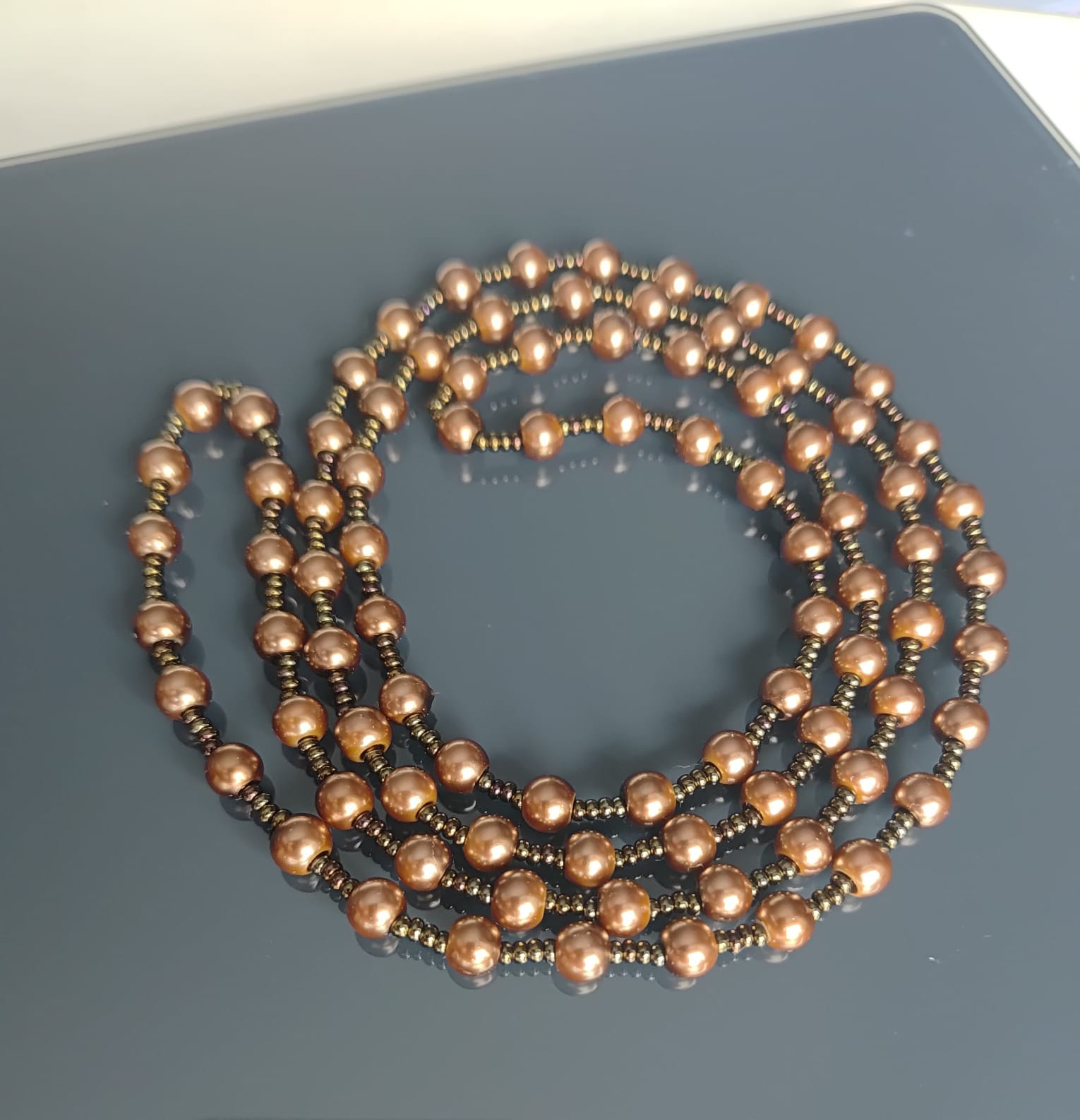 Perełki szklane małe 5 mm i koraliki drobne szkło w kolorze metalizowanym. Sznur długi 47 cm, kolor zlotego brązu. Lekki naszyjnik bez metalu, bez zapięcia, zakładany przez głowę.